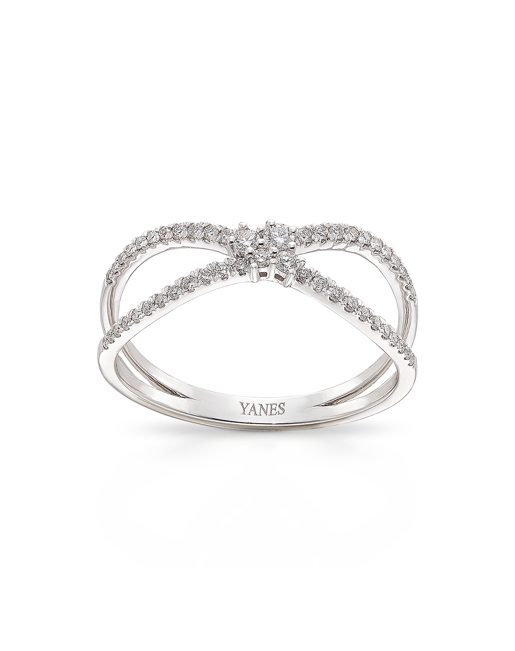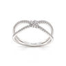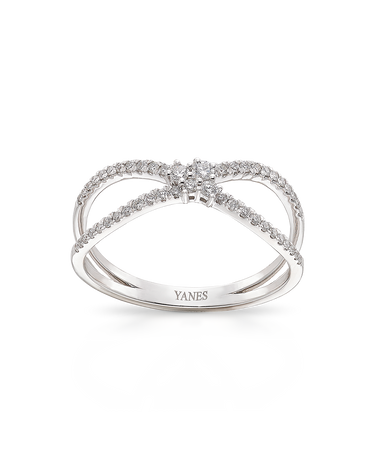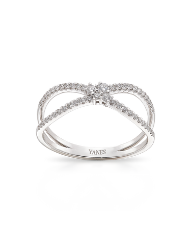 Anillo 2 aros cruzados y centro roseta, diamantes talla brillante, peso 0,26 ct, oro blanco de 18K. Ancho máximo 7 mm, en disminución. Colección Prima.
