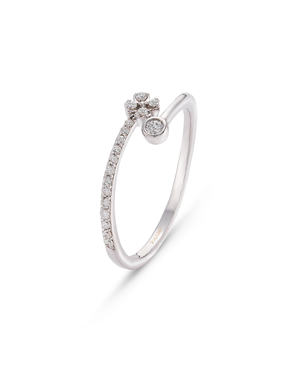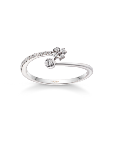 Anillo en forma de "Tú y yo" terminada en flor de diamantes talla brillante de peso 0,12 ct. En oro blanco de 18K. Colección Prima.