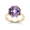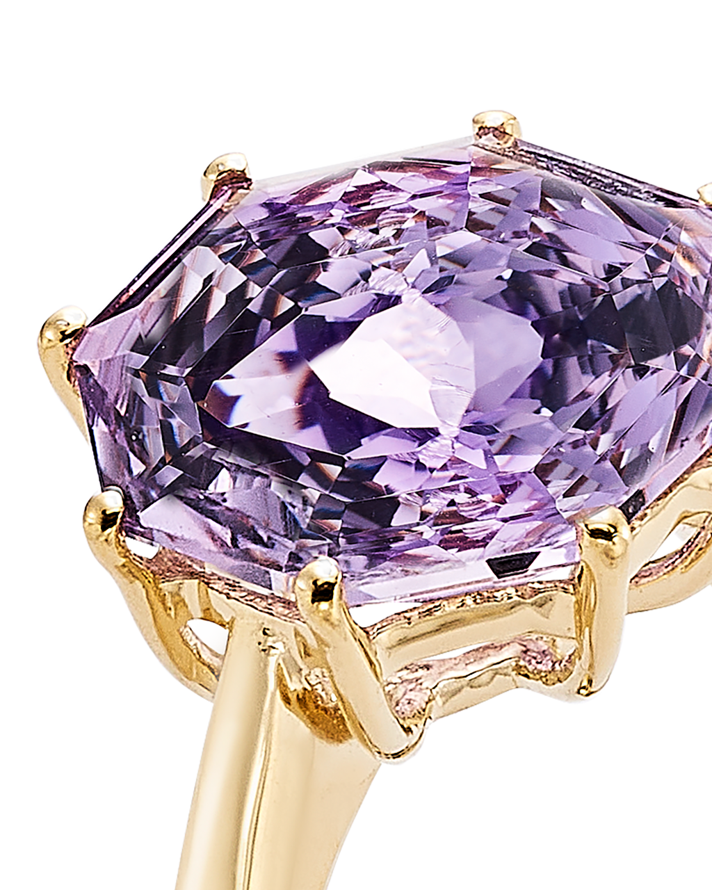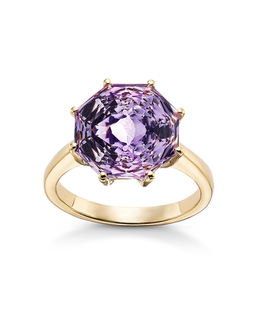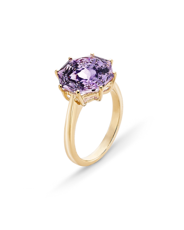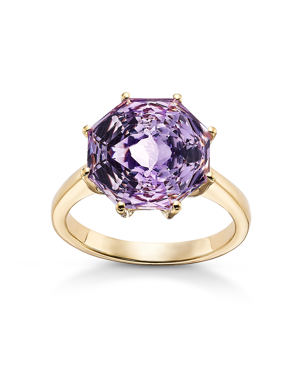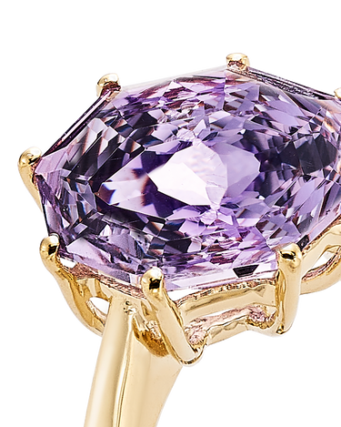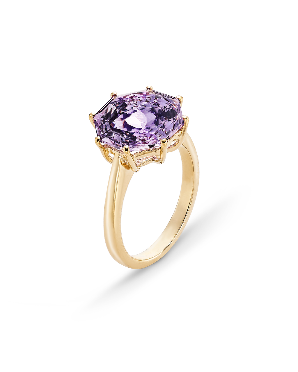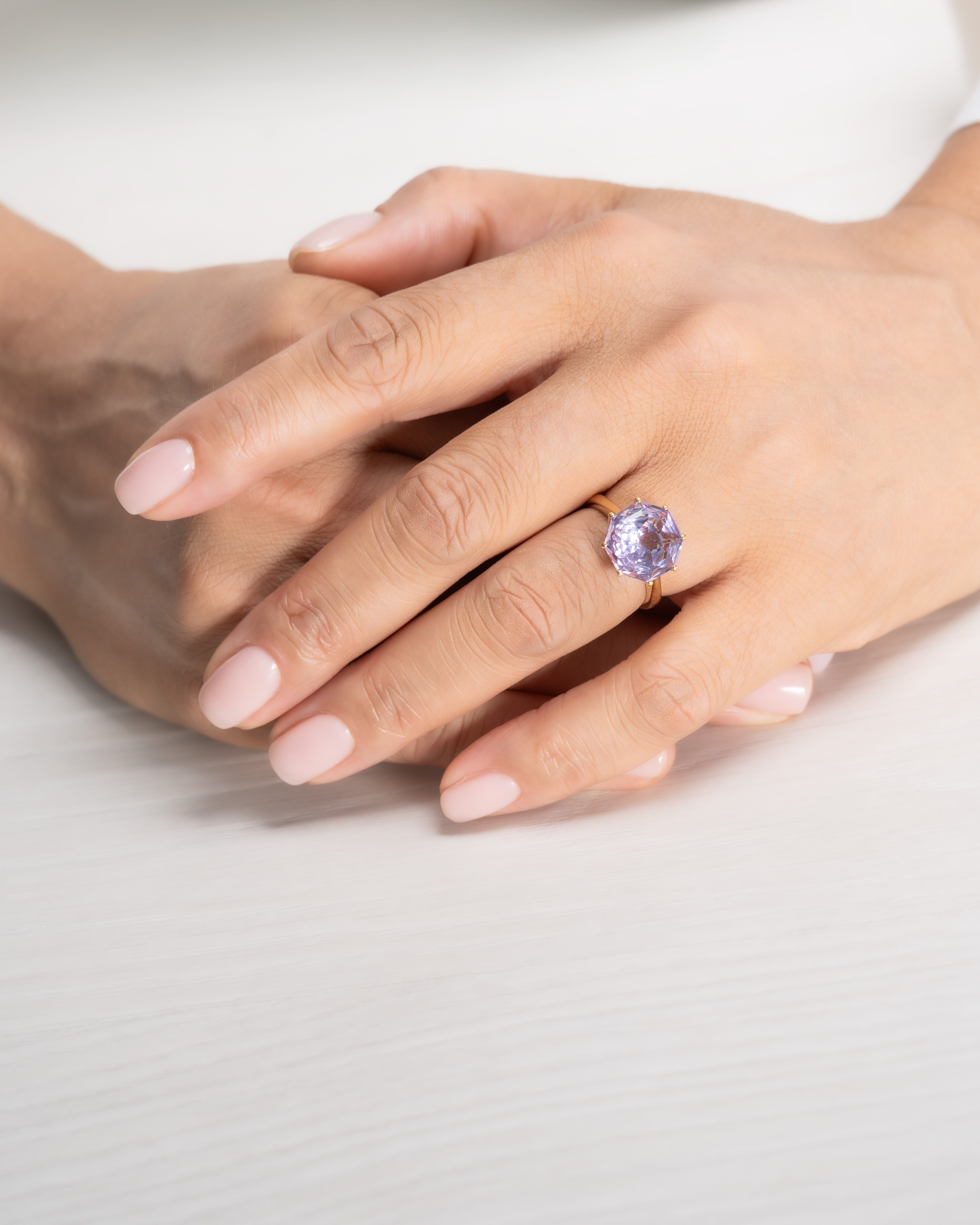 Anillo amatista talla brillante en ocho garras, plata de ley dorada. Diámetro 12 mm. Colección Princesa.