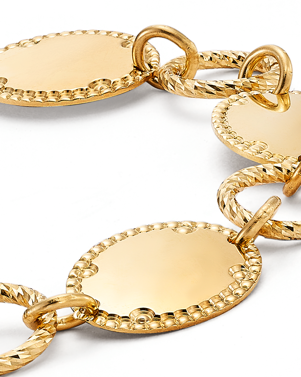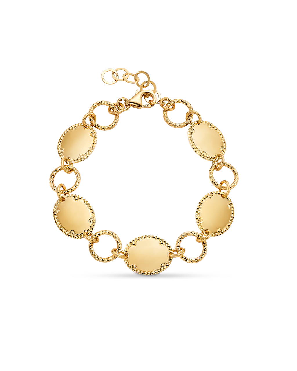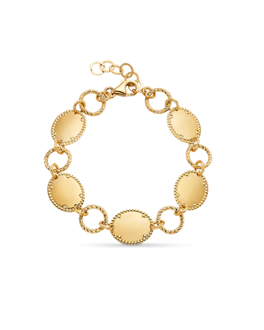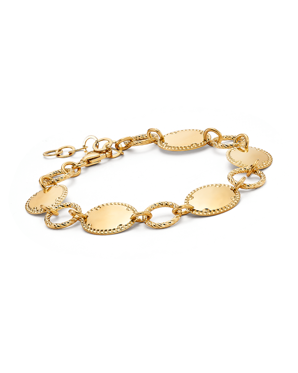 Pulsera eslabones ovalados lisos bisel cordón, plata de ley dorada. Medida eslabón 12 x 15 mm, largo total 16 - 20 cm. Colección Liceo.