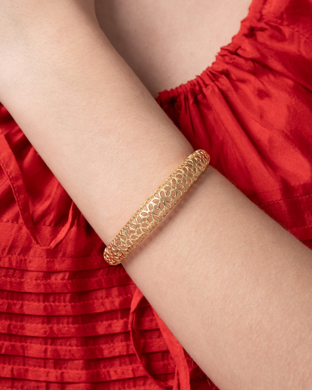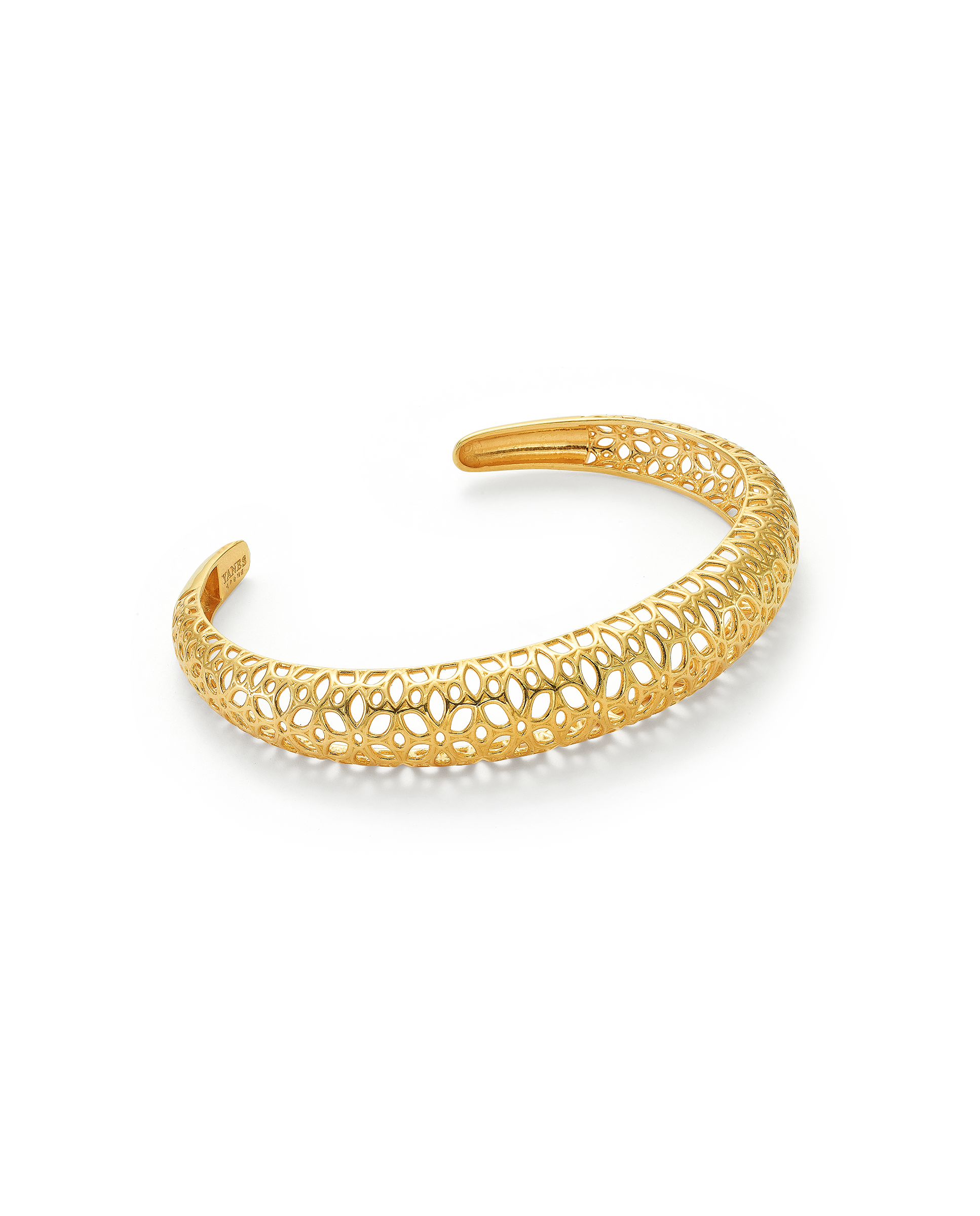 Pulsera en plata de ley dorada, flores caladas. Ancho 1,1 cm en disminución. Colección Costa de la Luz.