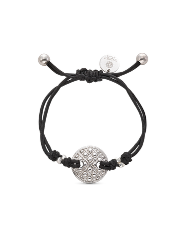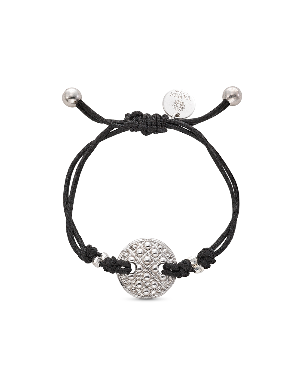 Pulsera centro botón acabado "tambor", cordones y bolas, plata de ley y cordón seda ajustable. Diámetro botón 18 mm. Colección Malpica Young.