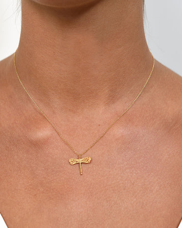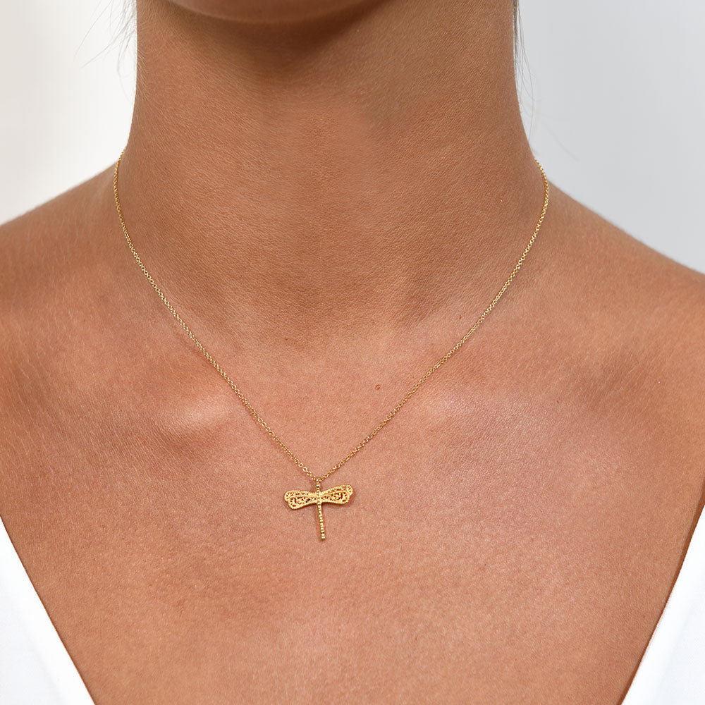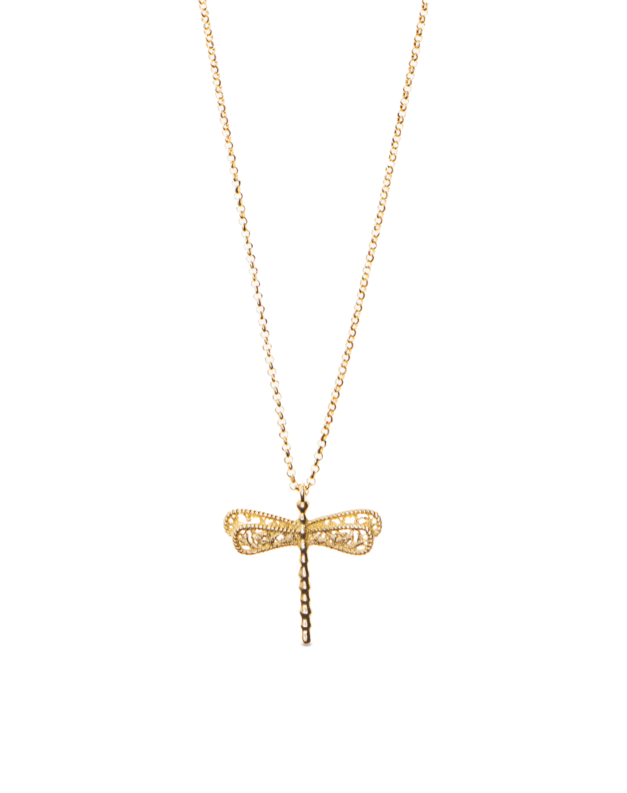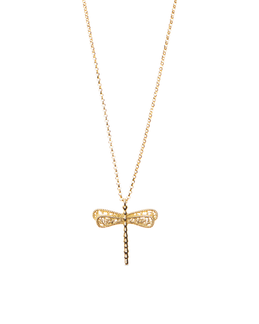 Colgante libélula con cadena, en oro amarillo de 18K. Largo cadena 46 cm. Colgante 18 x 17 mm.