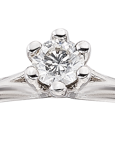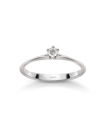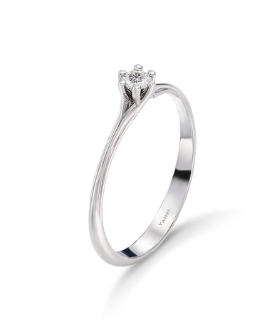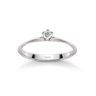 Anillo solitario, diamante talla brillante, seis garras, peso 0,11 quilates. Oro blanco de 18K. Colección Kimberly.