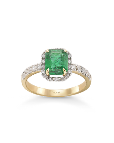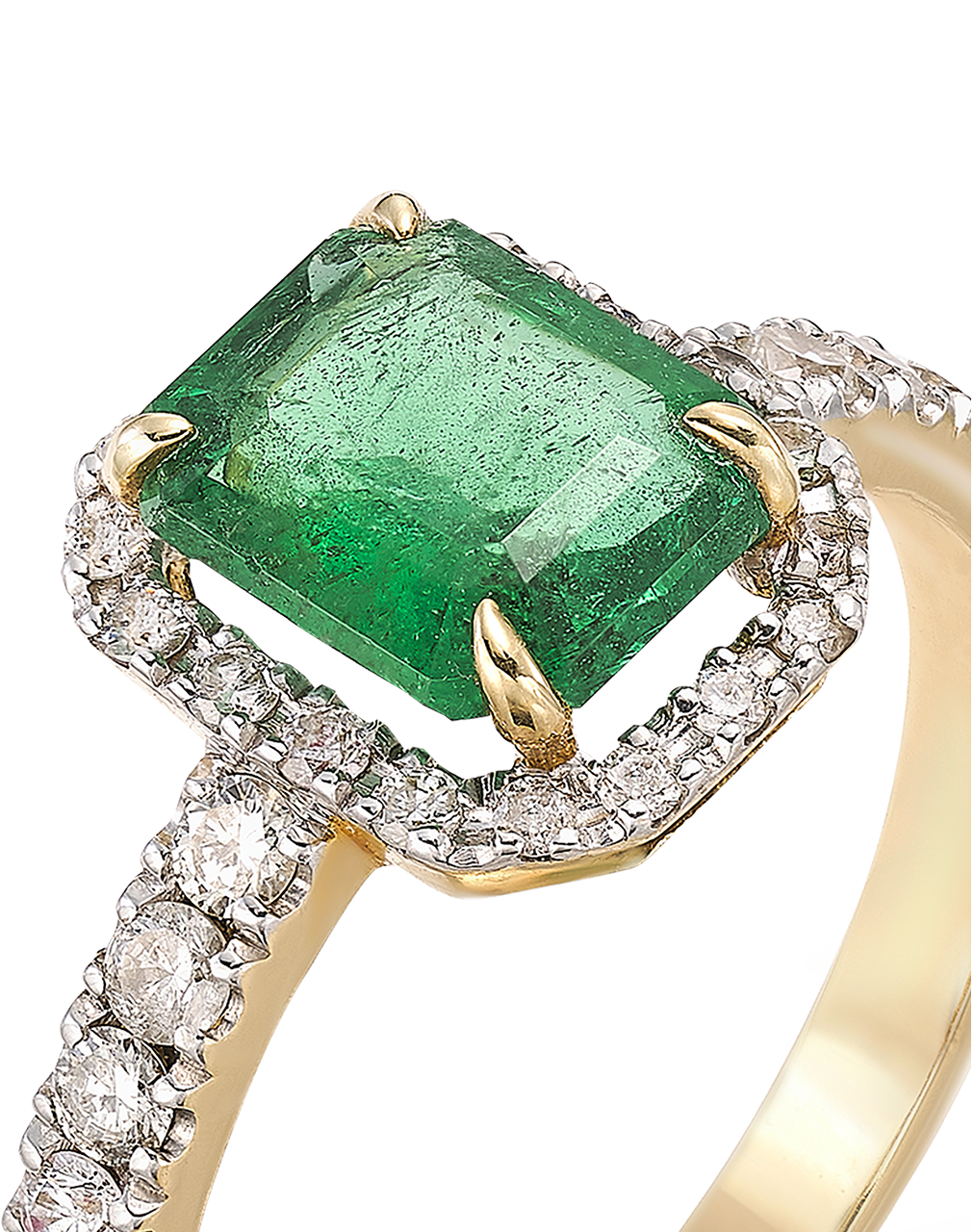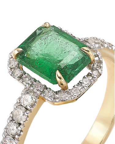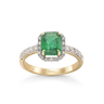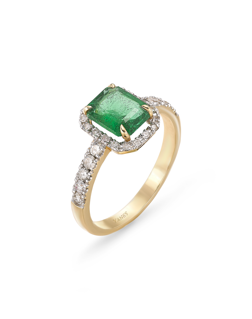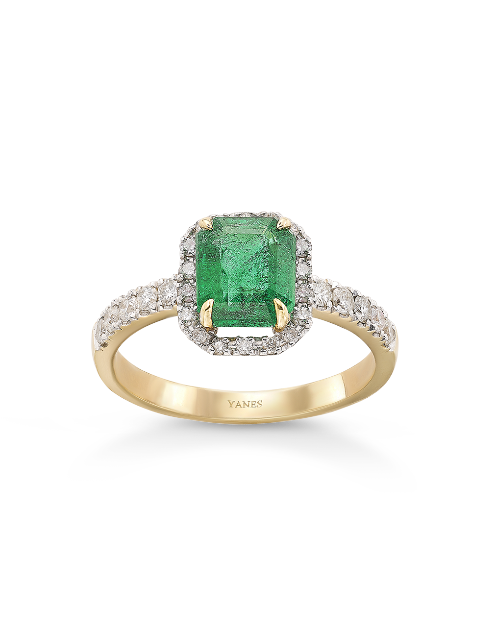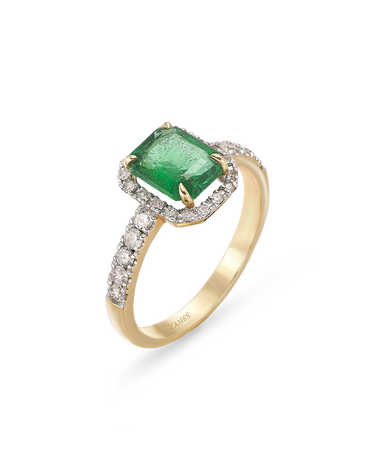 Emerald cut emerald centre ring, weight 1.24 ct, border and arm 28 brilliant cut diamonds, weight 0.35 ct., 18K gold, weight 3.20g. Centre measurements 8 x 6 mm., arm 2.5 mms. Beauty Colors Collection.