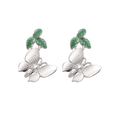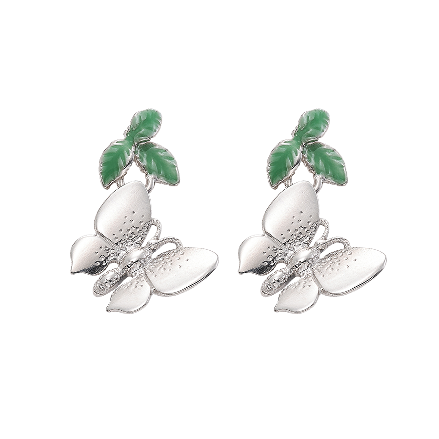 Mini green enamel leaf earrings, smooth butterfly pendant, sterling silver. Leaves 8mm, butterfly 15 x 12mm. Italica Collection.