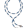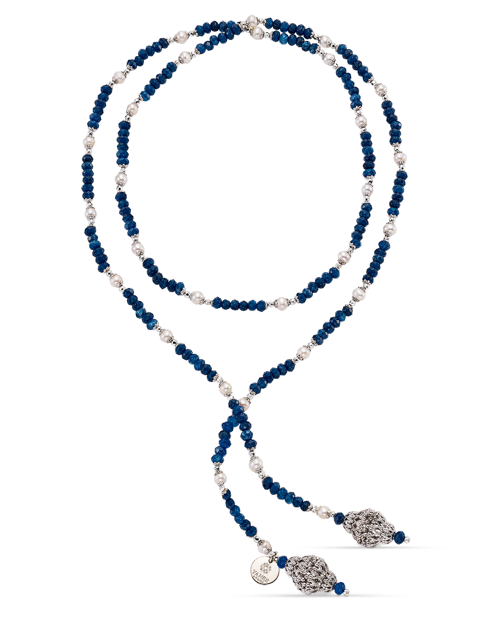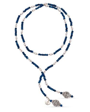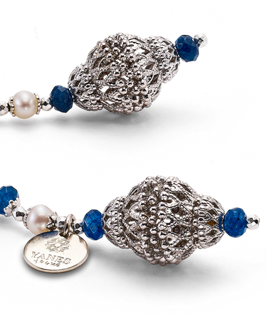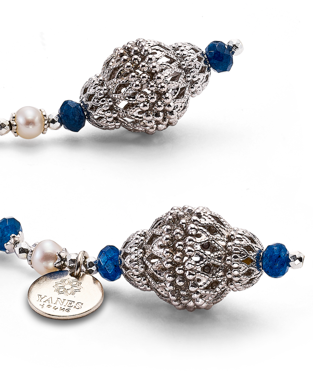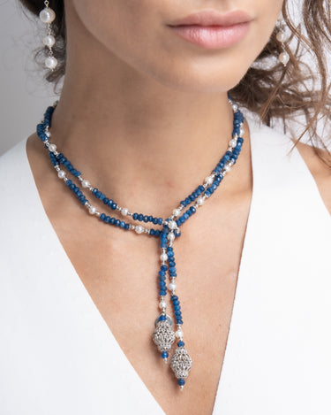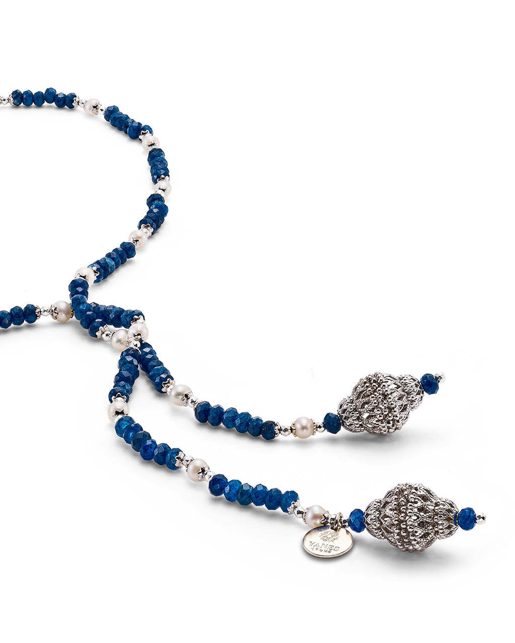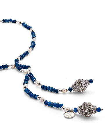 Collar corbatero bolas ágata azul y perlas, terminales celosía, plata de ley. Largo 92 cm. Colección Scala.