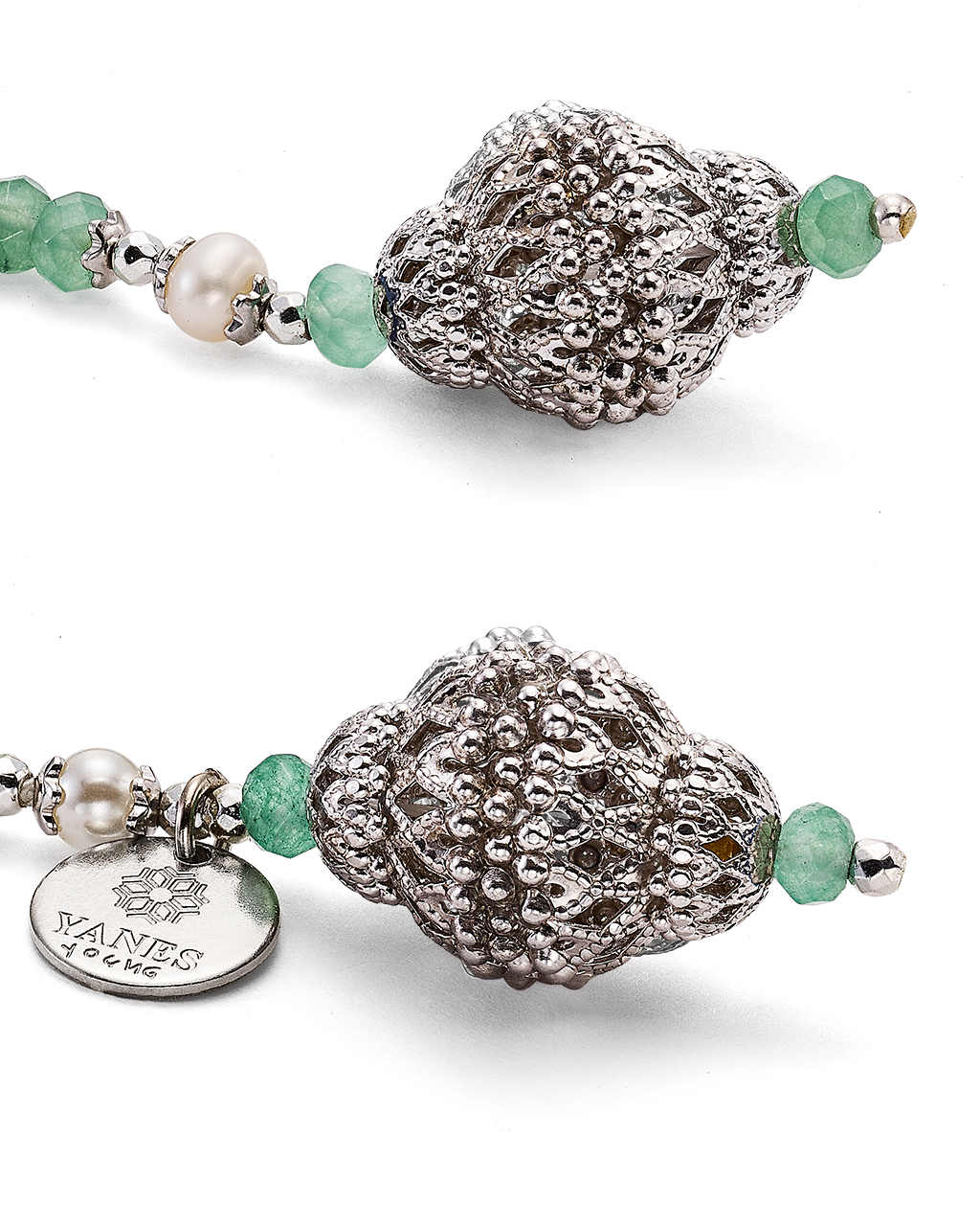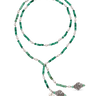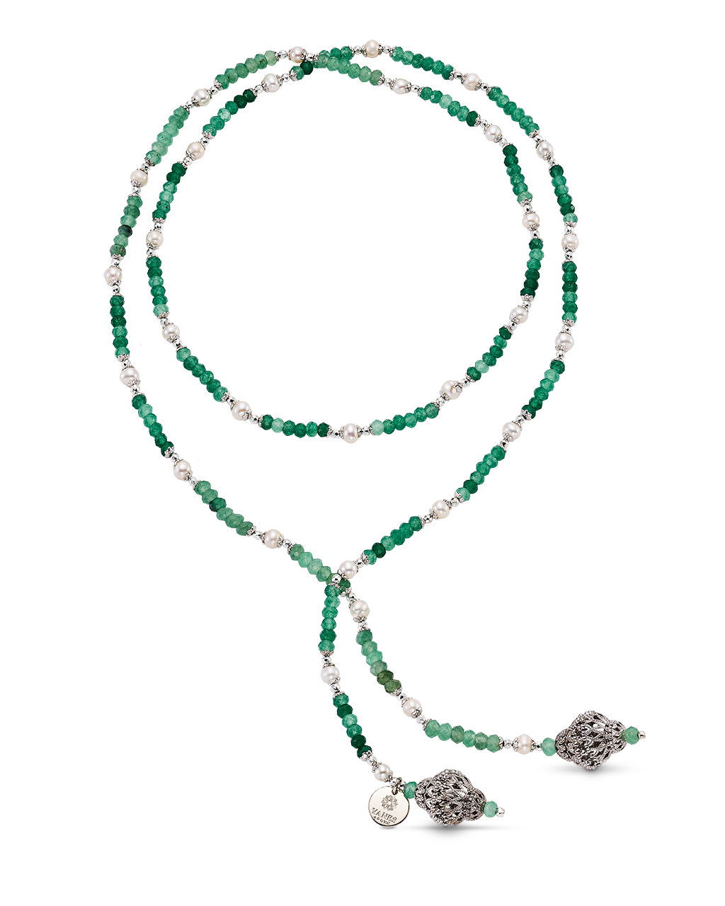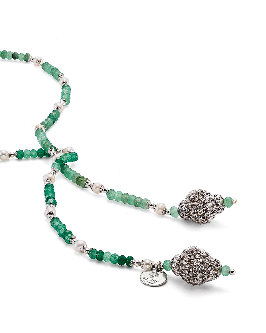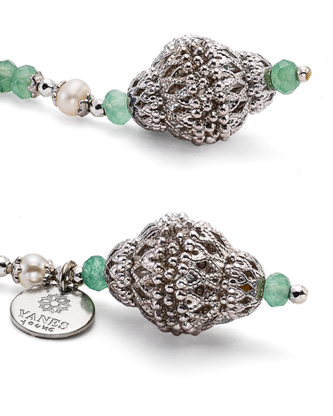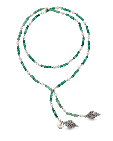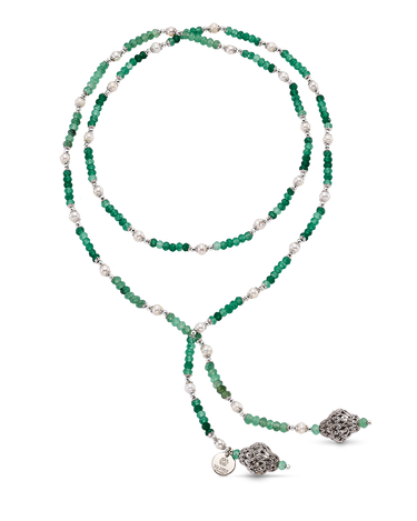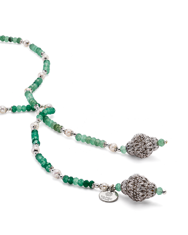 Collar corbatero bolas ágata verde y perlas, terminales celosía, plata de ley. Largo 92 cm. Colección Scala.