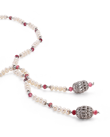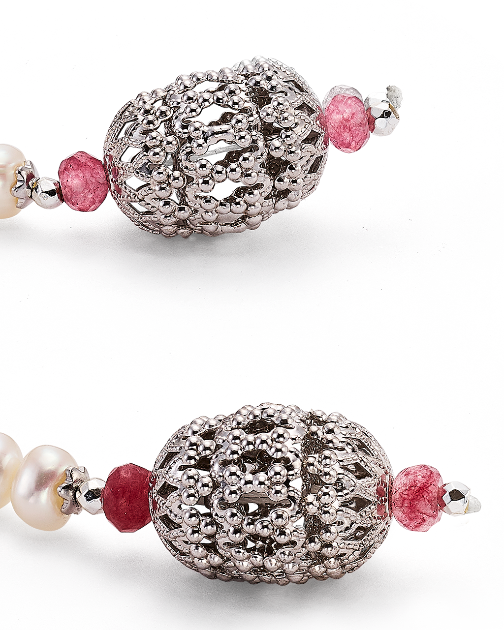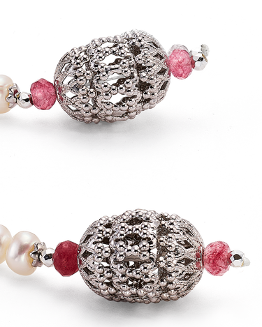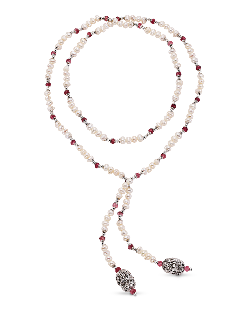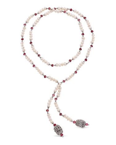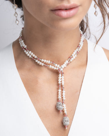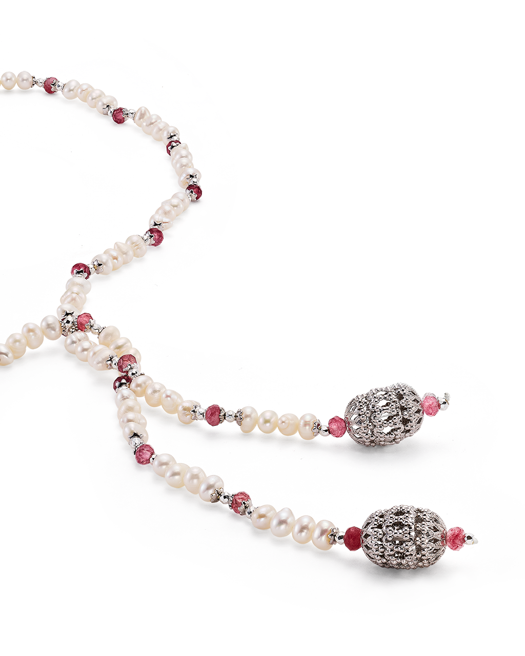 Collar corbatero perlas y bolas ágata roja, terminales celosía, plata de ley. Largo 90 cm. Colección Scala.