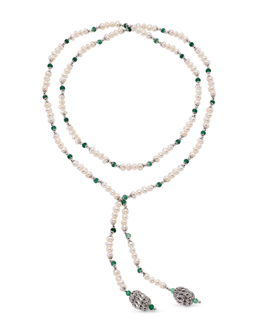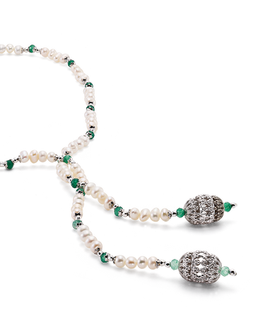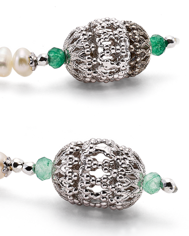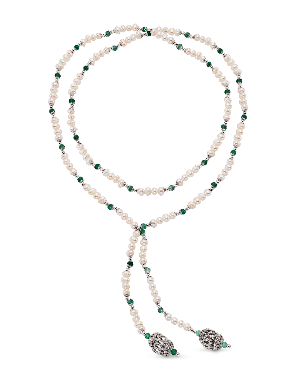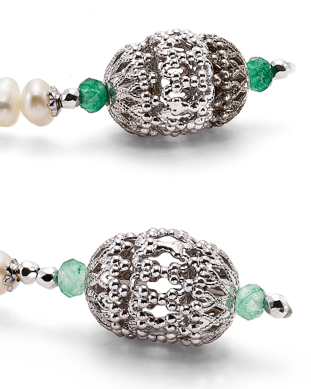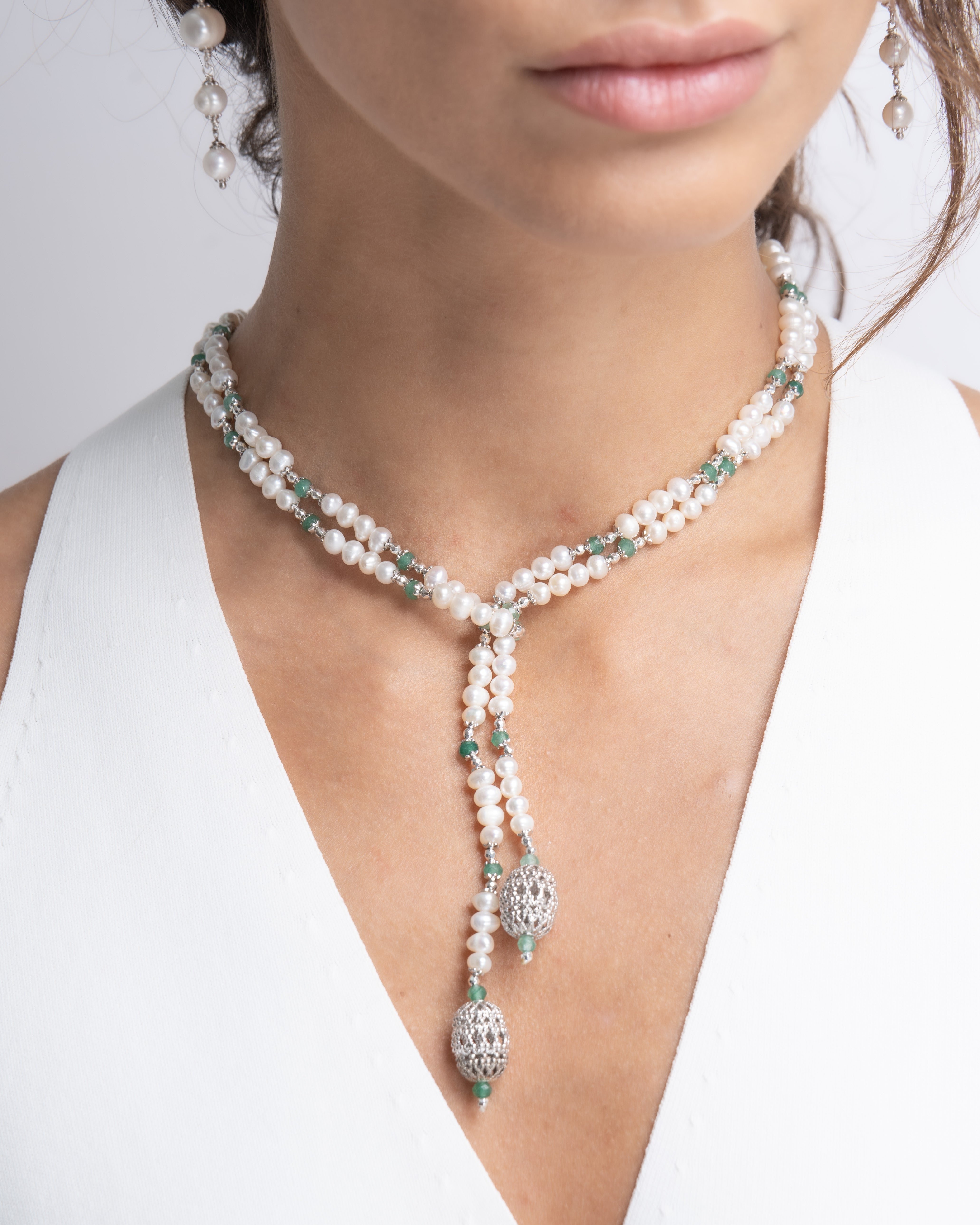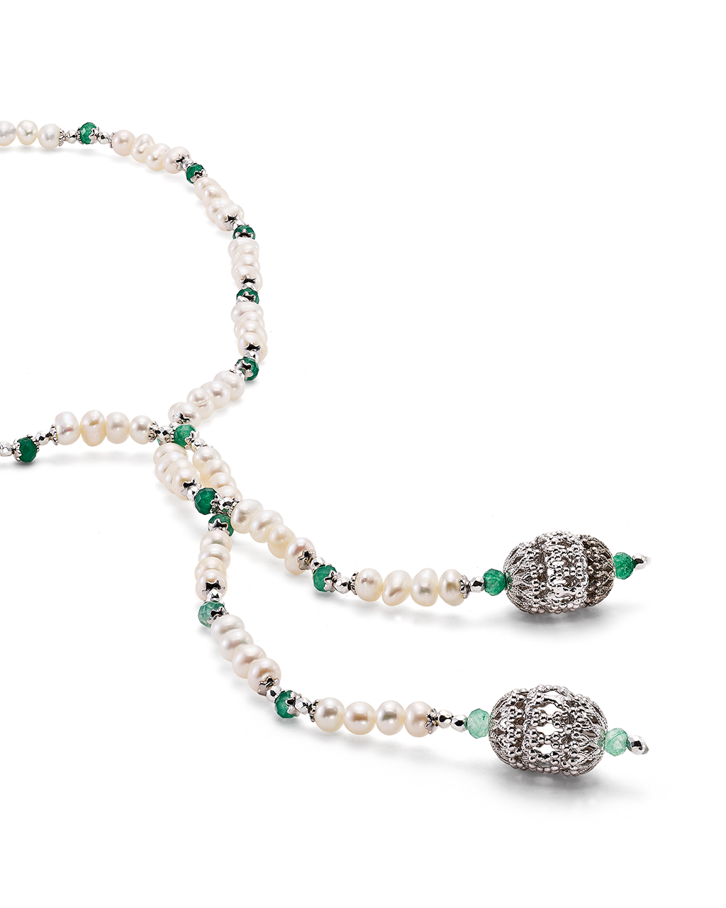 Collar corbatero perlas y bolas ágata verde, terminales celosía, plata de ley. Largo 99 cm. Colección Scala.