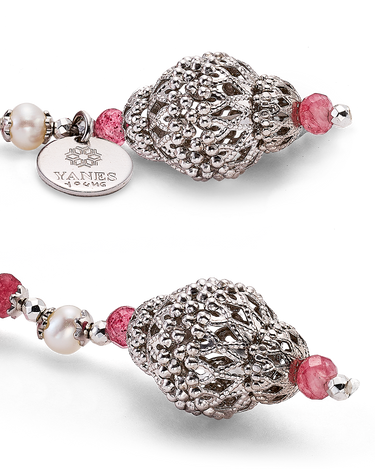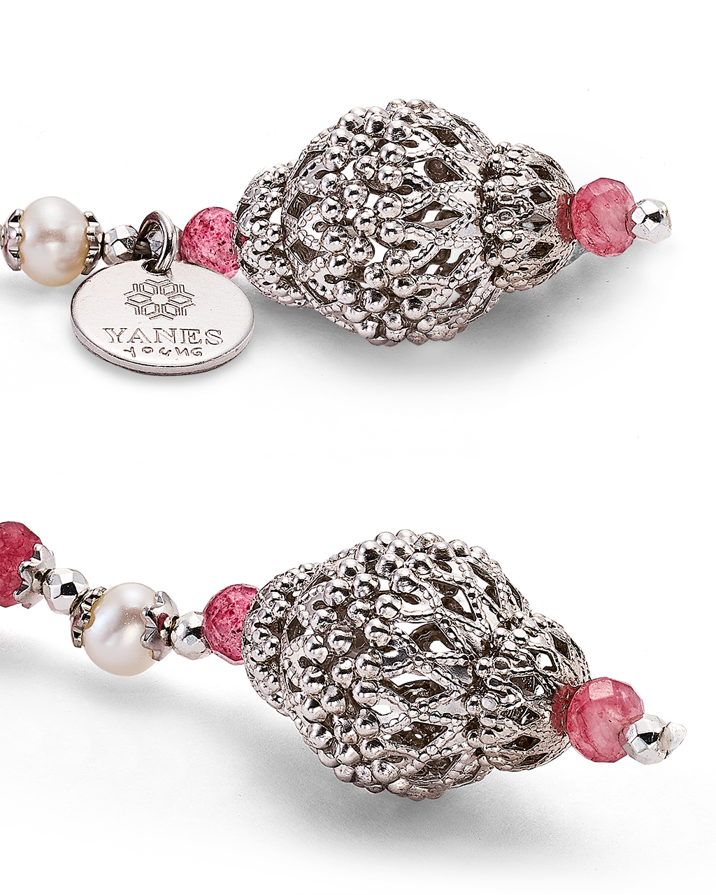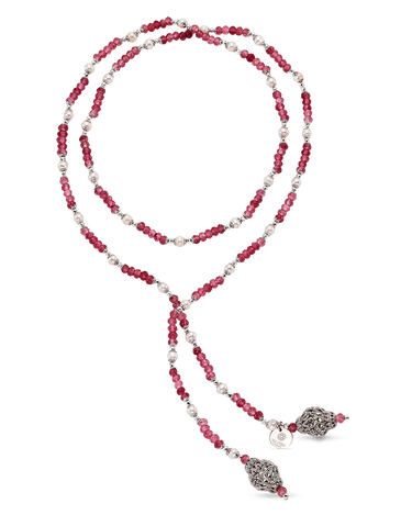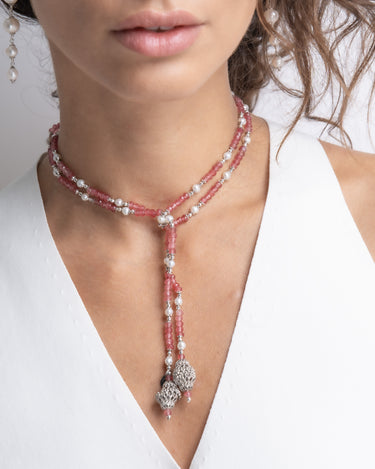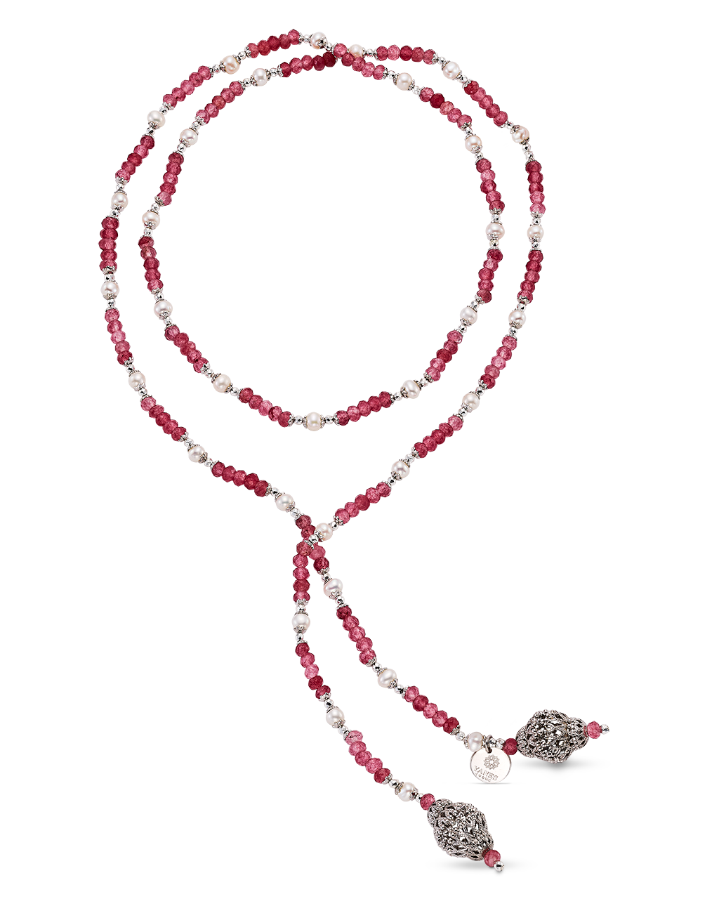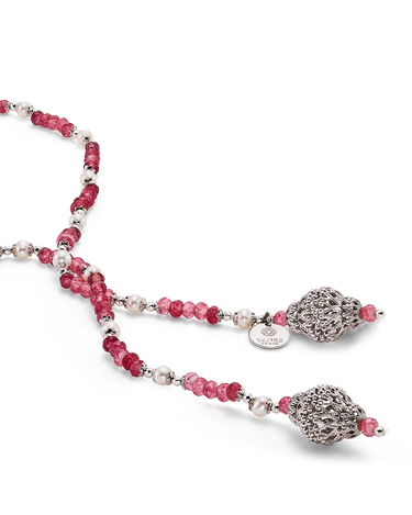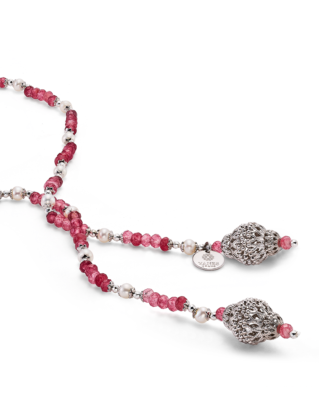 Collar corbatero bolas ágata roja y perlas, terminales celosía, plata de ley. Largo 92 cm. Colección Scala.