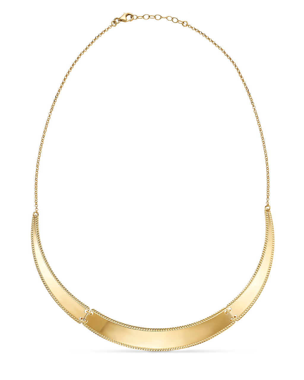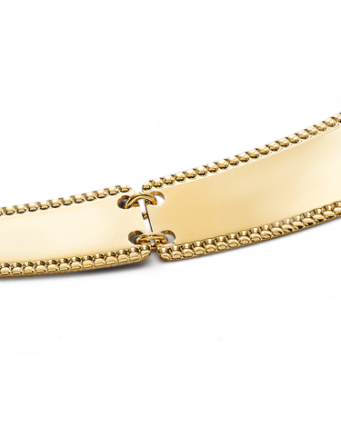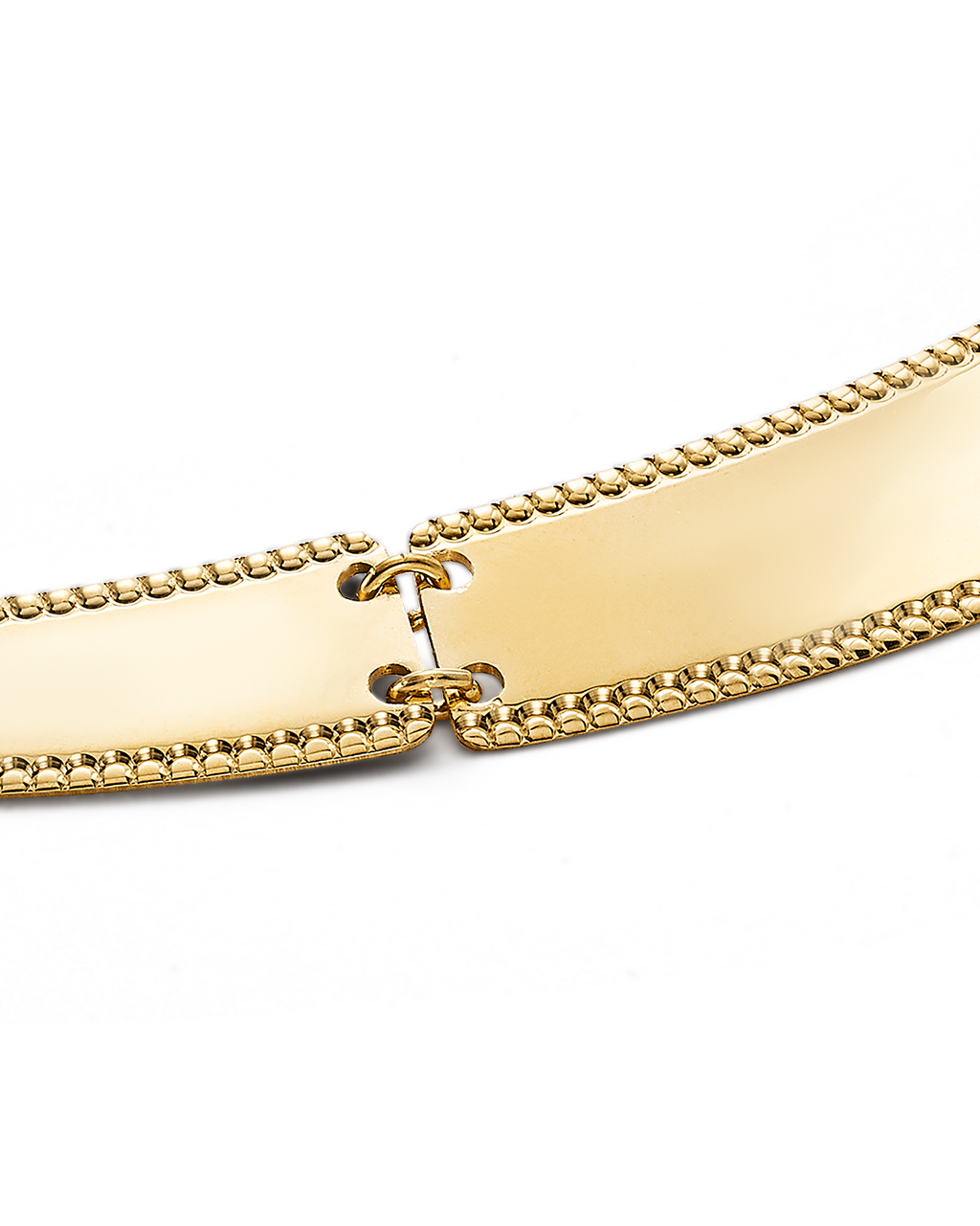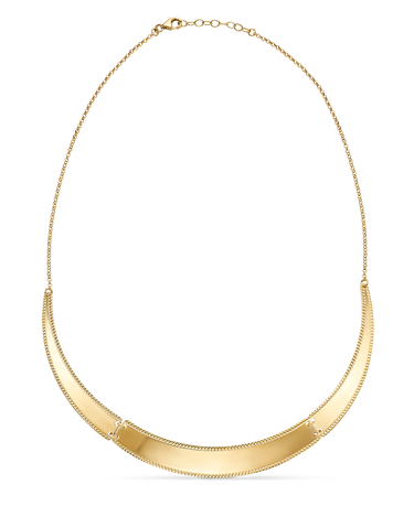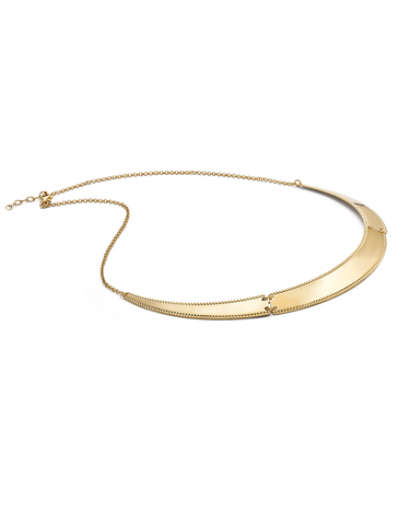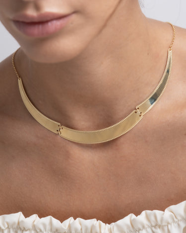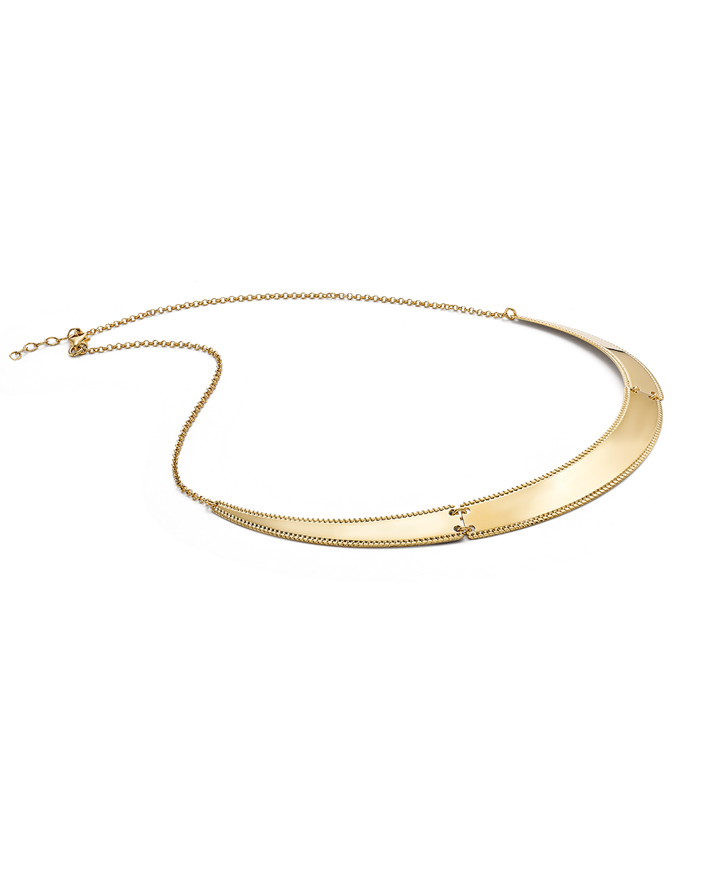 Collar gargantilla media luna articulada bisel cordón, plata de ley dorada. Medida centro 15 mm, largo total 40 - 43 cm. Colección Liceo.