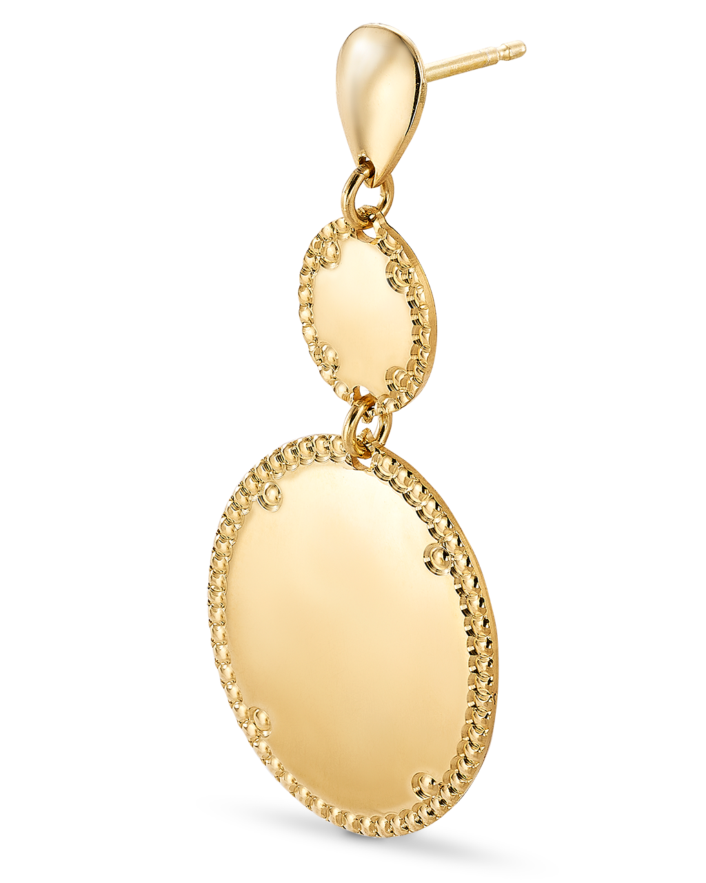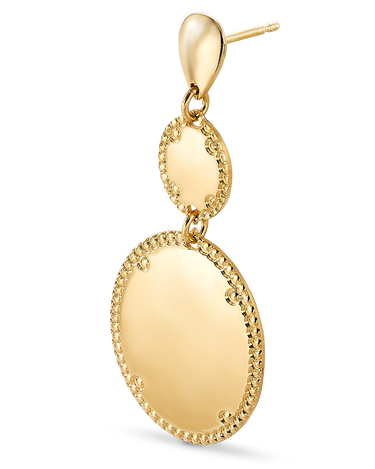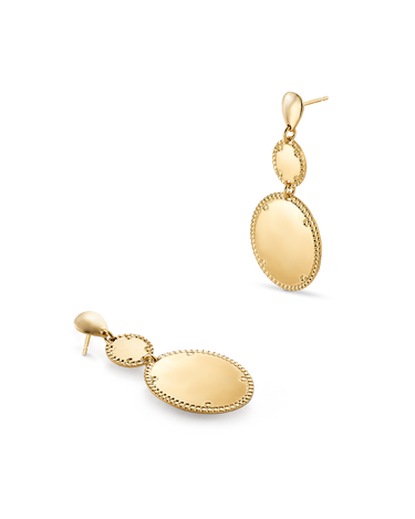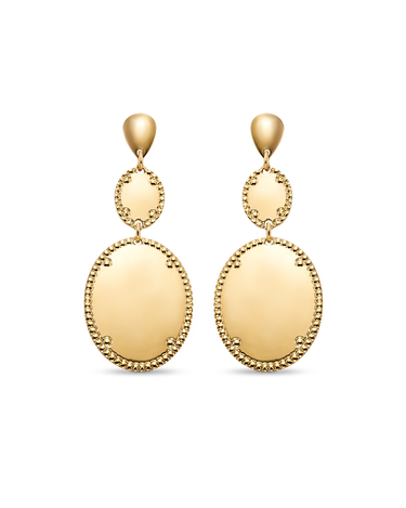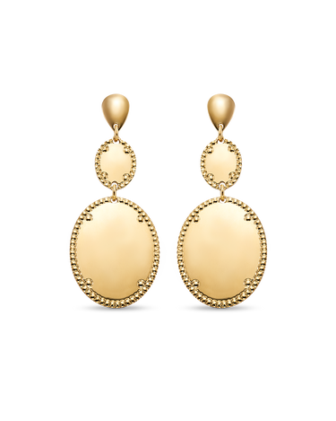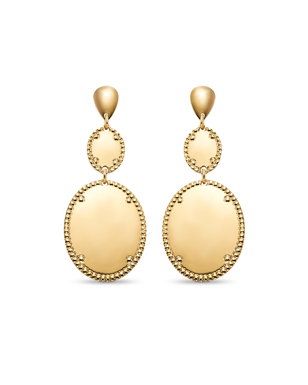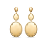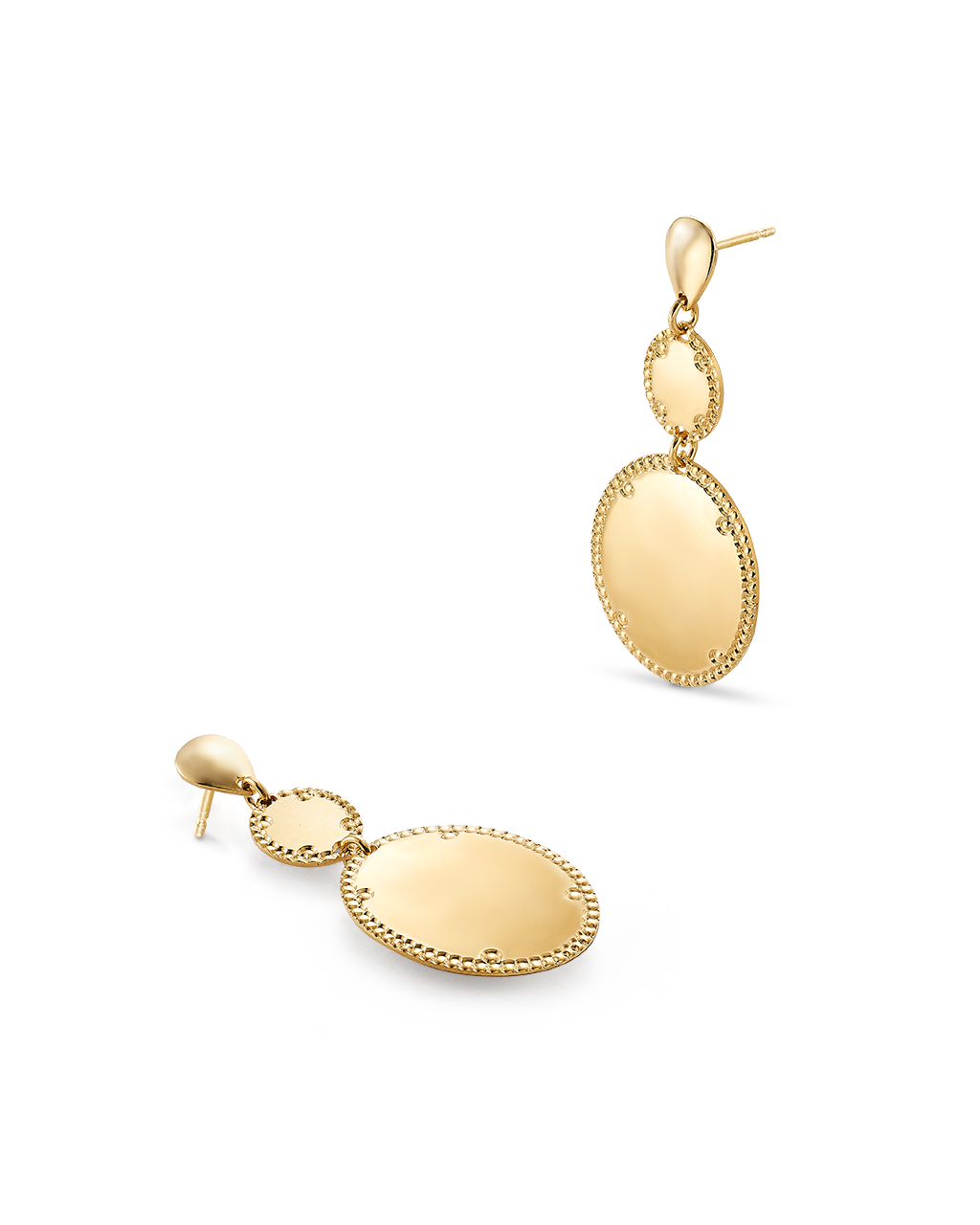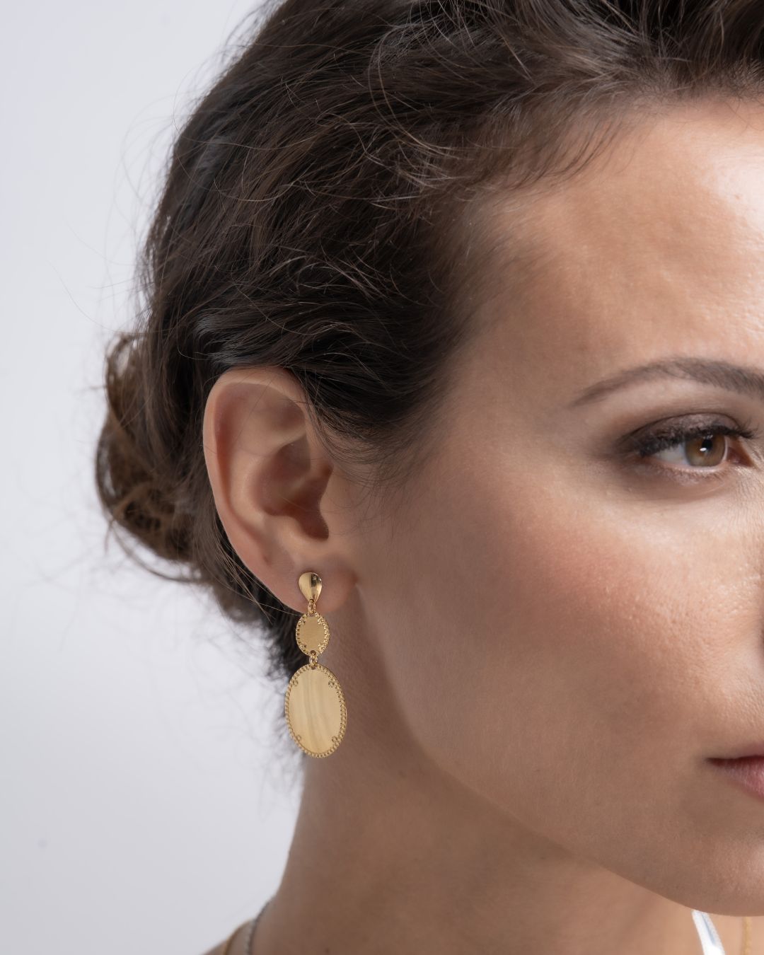 Pendientes colgantes dos centros ovalados bisel cordón, plata de ley dorada. Ancho 17 mm en disminución, largo total 42 mm. Colección Liceo.