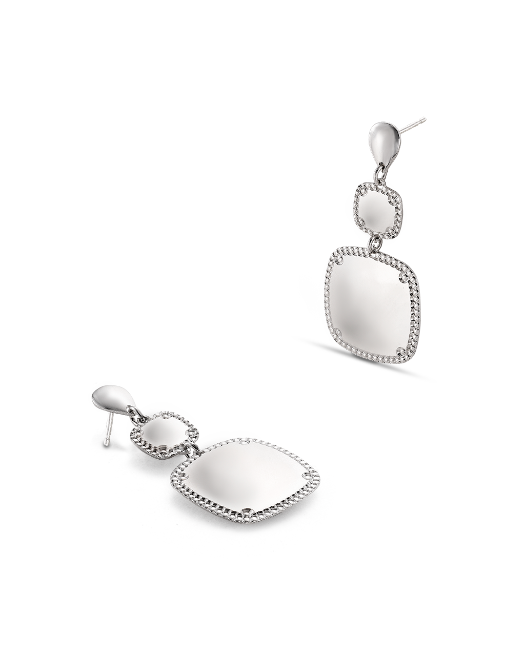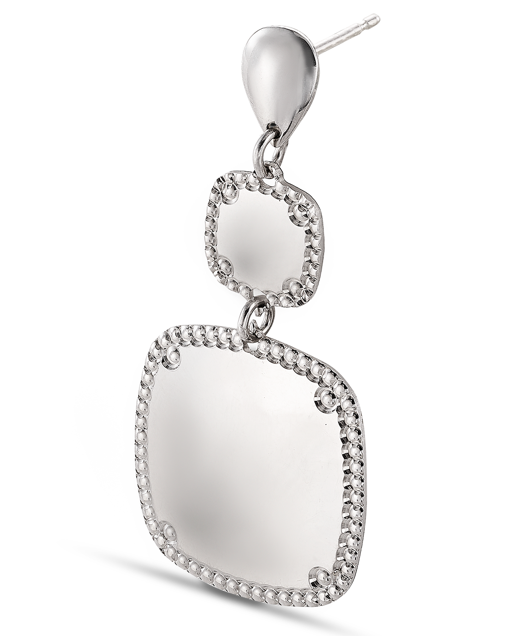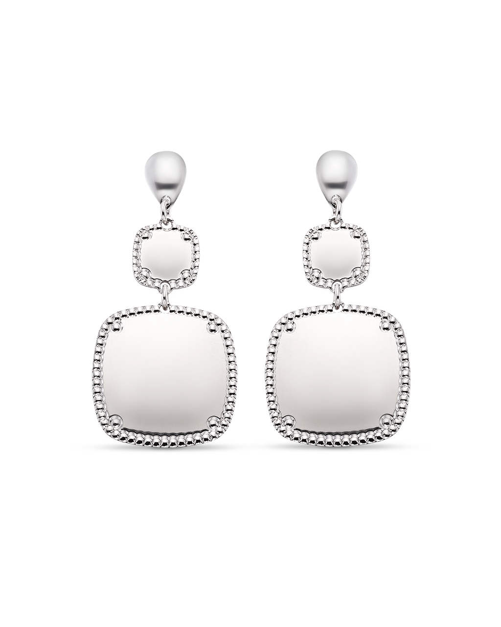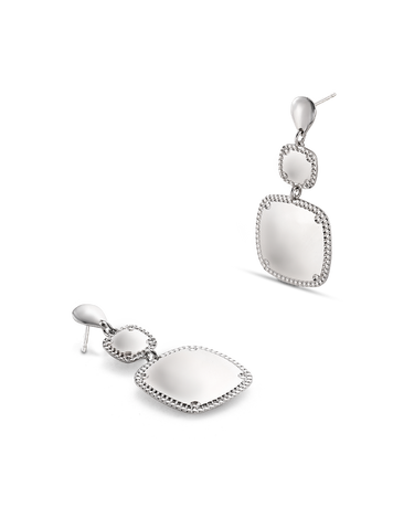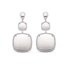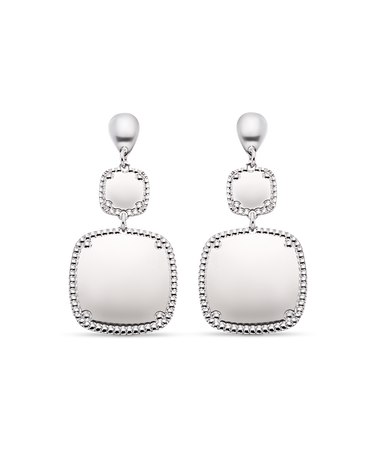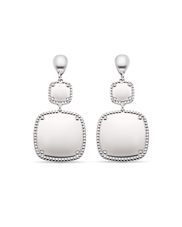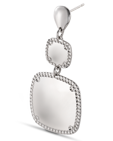 Pendientes colgantes dos centros cuadrados bisel cordón, plata de ley. Ancho 17 mm en disminución, largo total 42 mm. Colección Liceo.