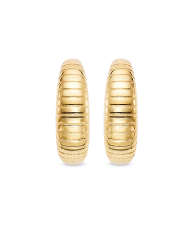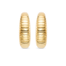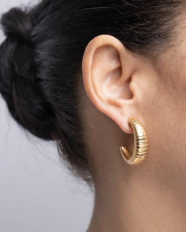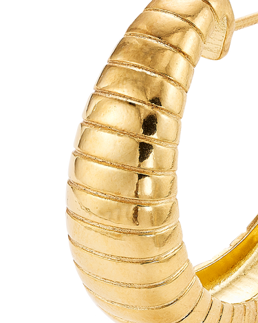 Pendientes aros grandes abiertos estriados, plata de ley dorada. Largo 3 cm, ancho en disminución 10 mm. Colección Met.