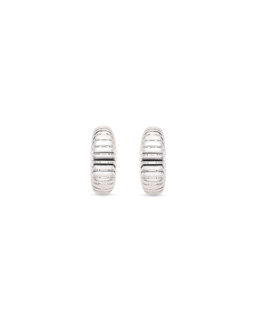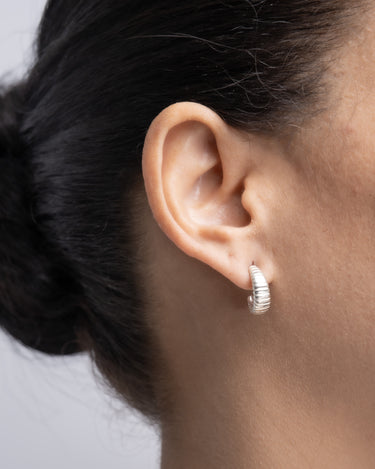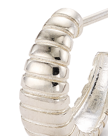 Pendientes aros pequeños abiertos estriados, plata de ley. Largo 1,5 cm, ancho en disminución 5 mm. Colección Met.