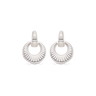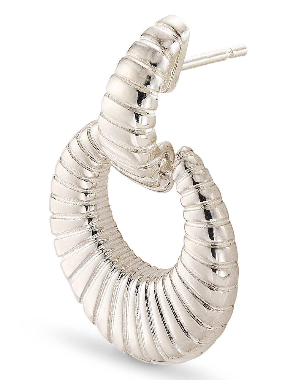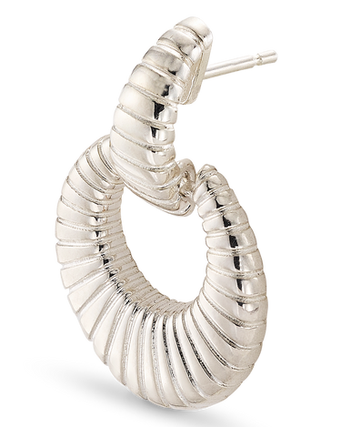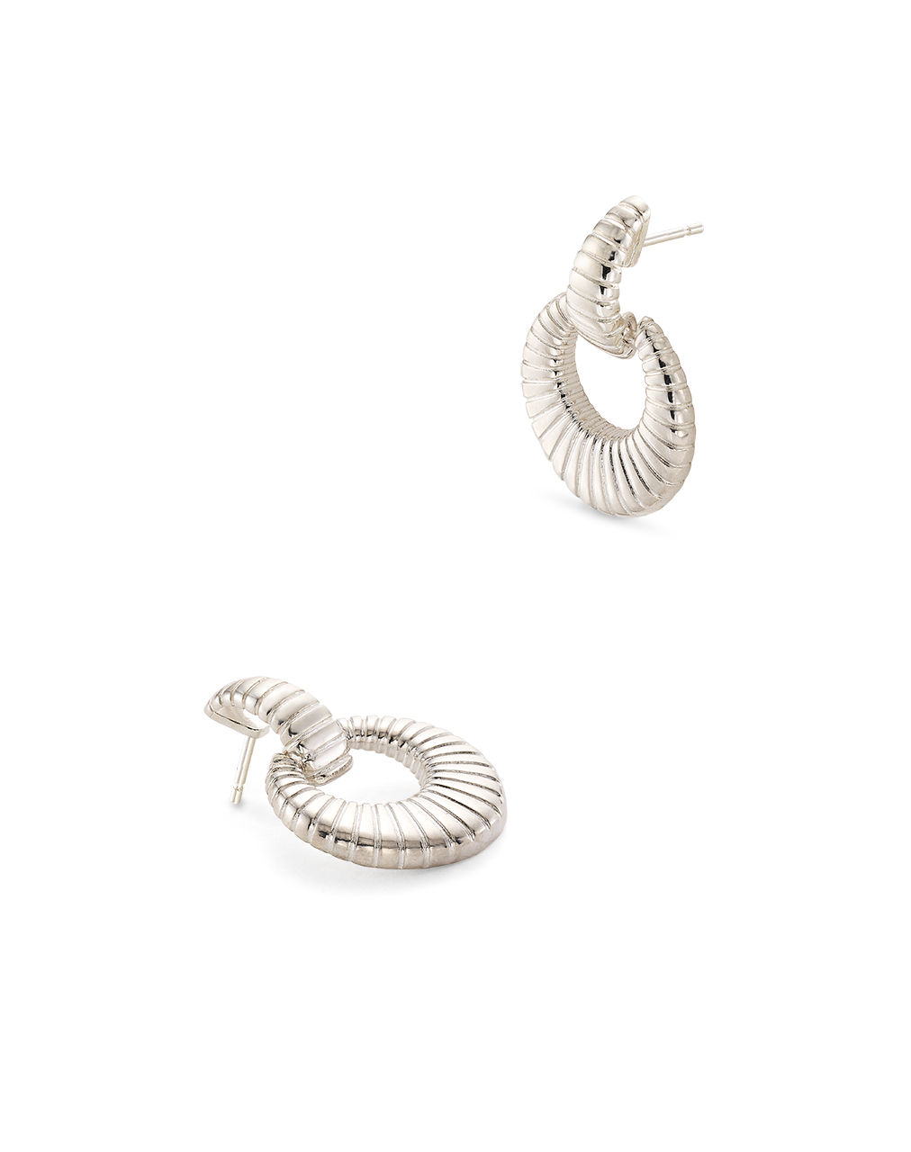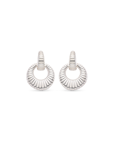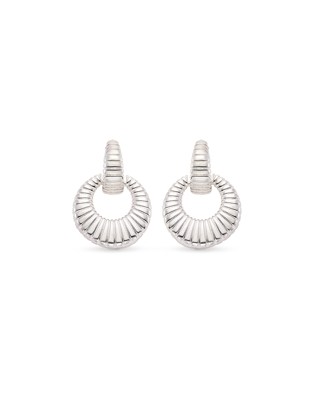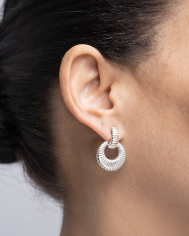 Pendientes colgantes circular estriados, plata de ley. Diámetro 2 cm, largo total 3,7 cm. Colección Met.