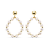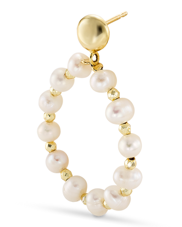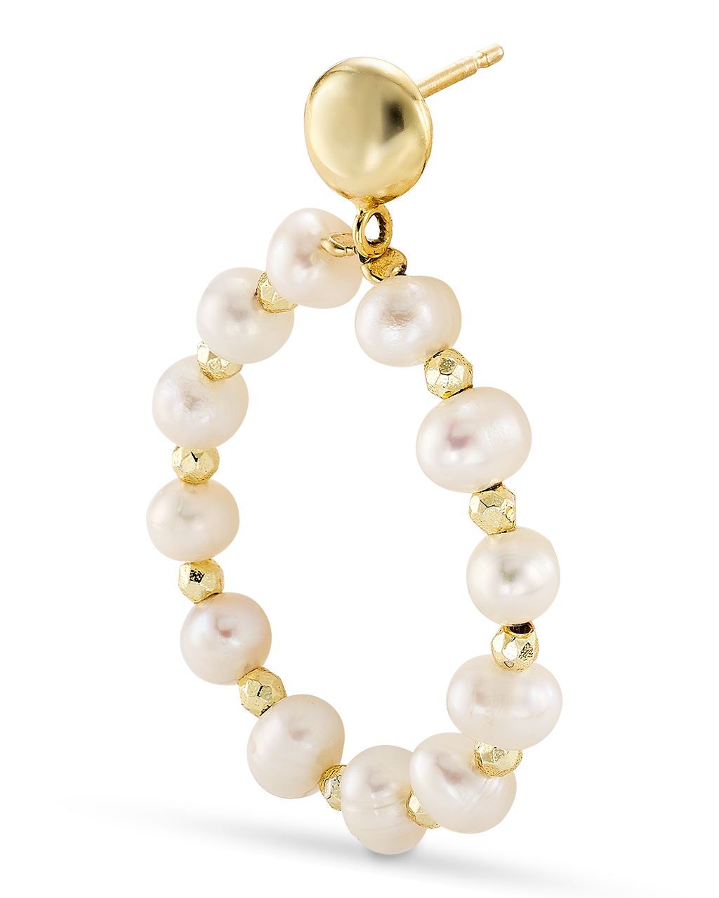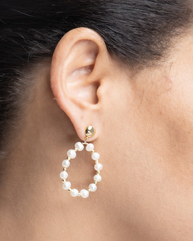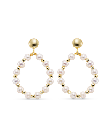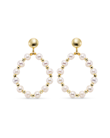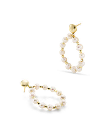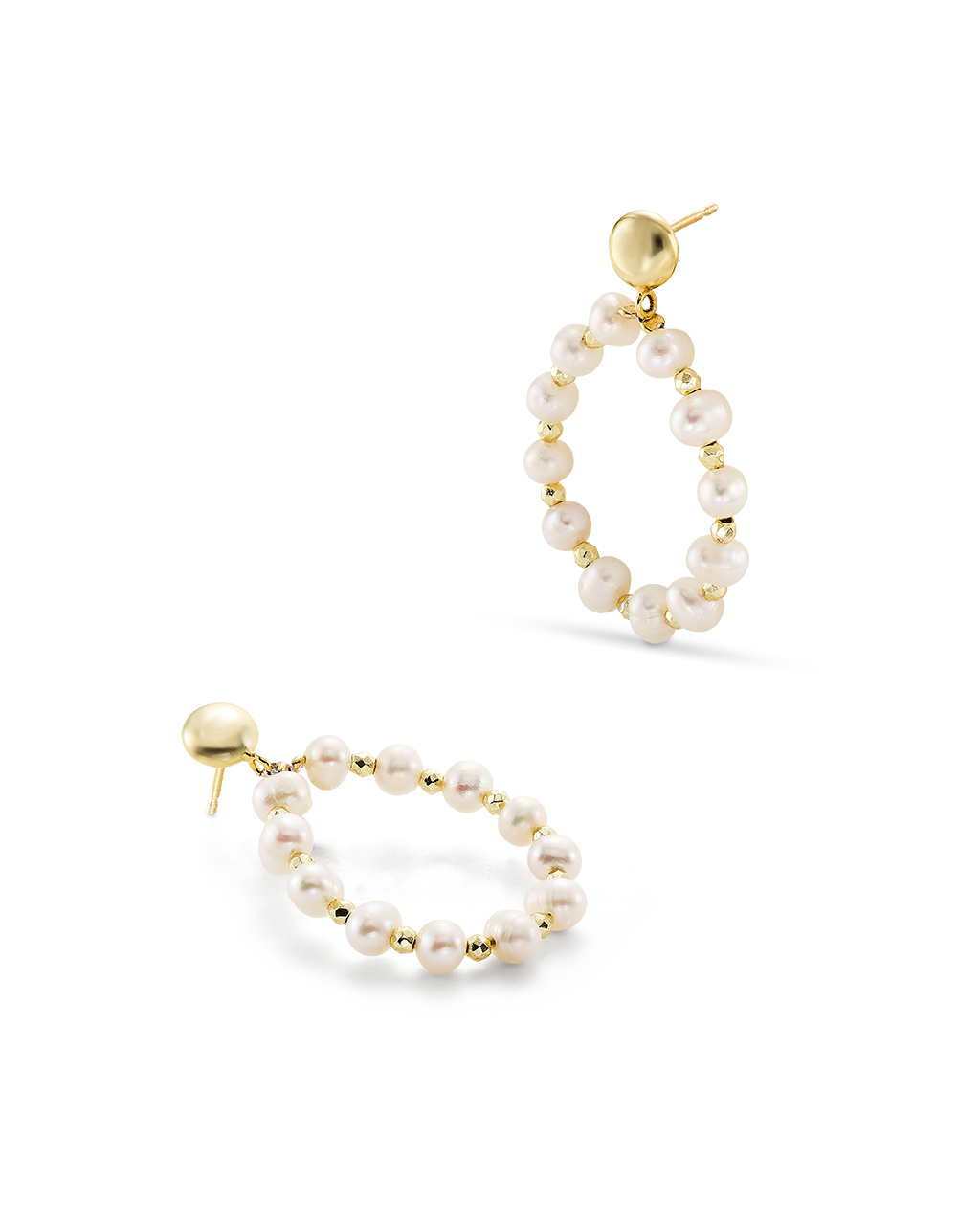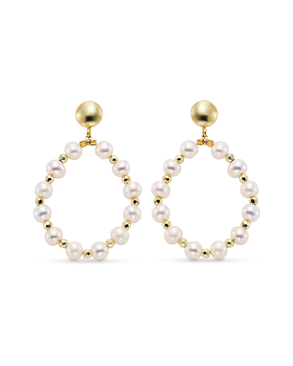 Aros colgantes bolas facetadas hematite y perlas, plata de ley dorada. Medida largo total 40 mm. Colección Scala.