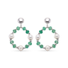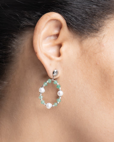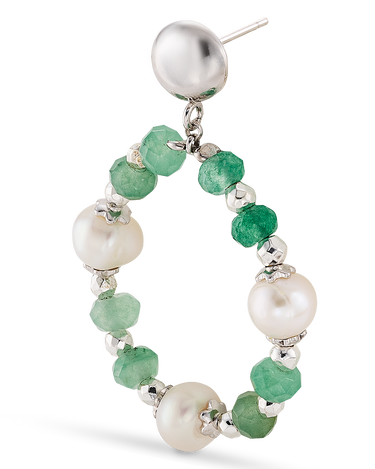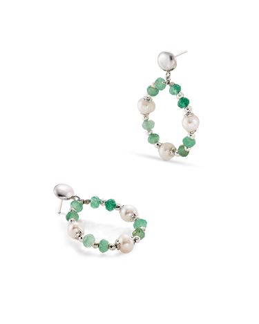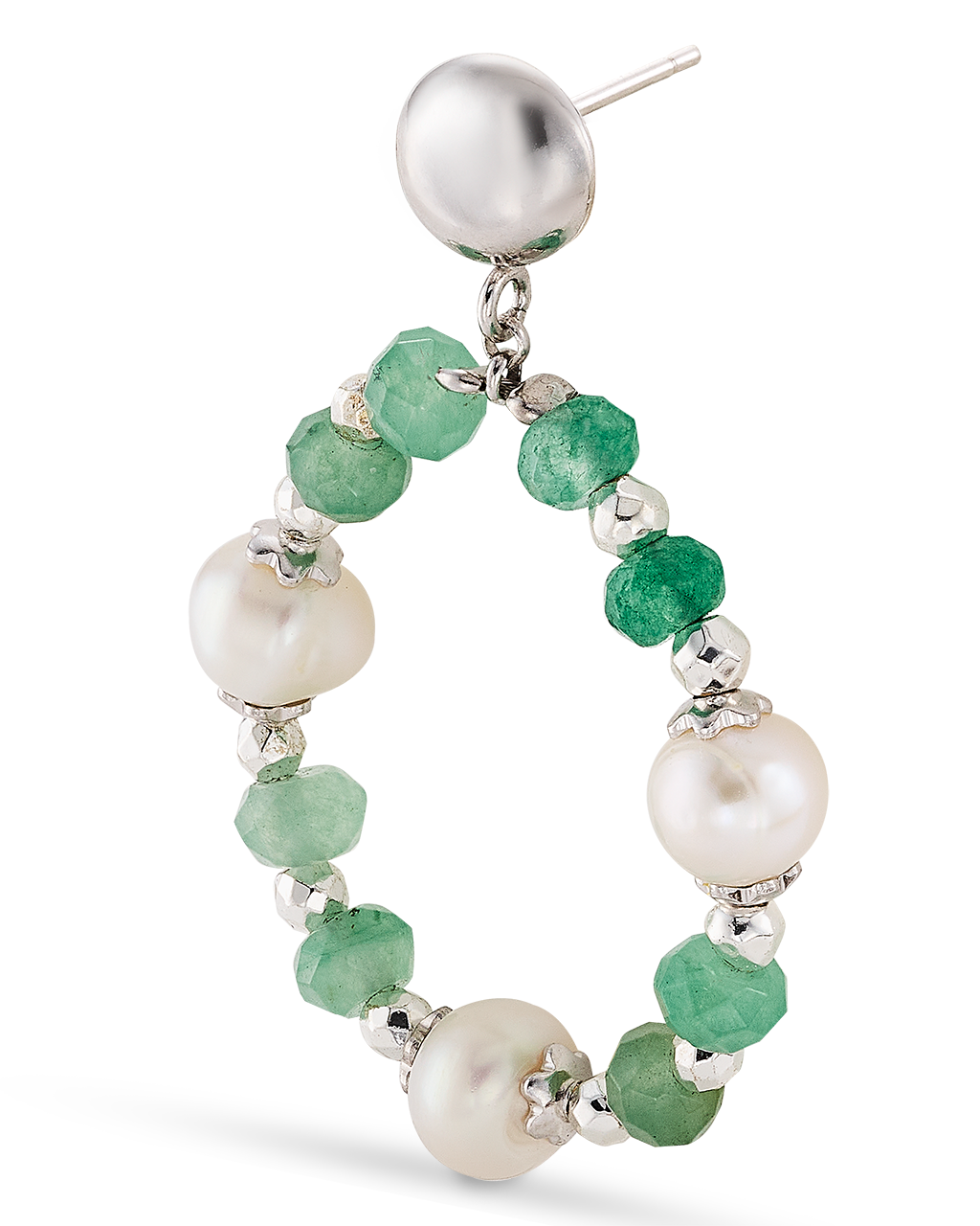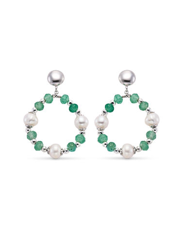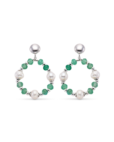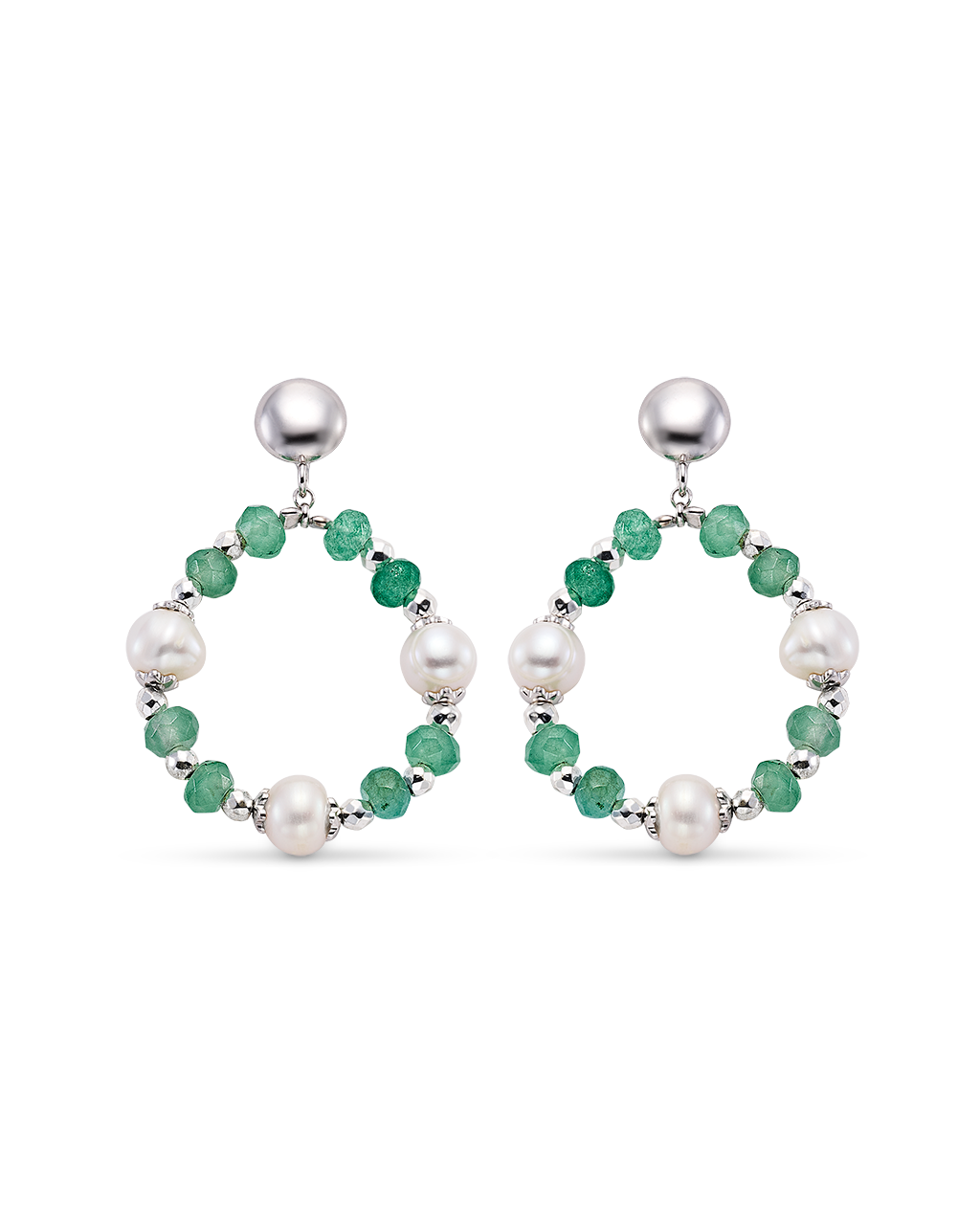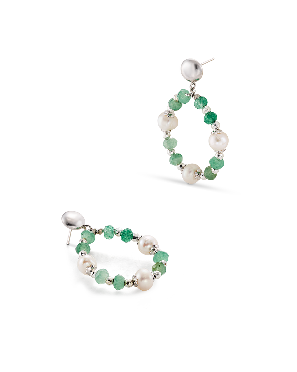 Aros colgantes bolas facetadas ágata verde y perlas, plata de ley. Medida largo total 40 mm. Colección Scala.
