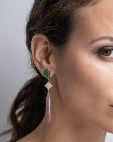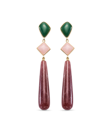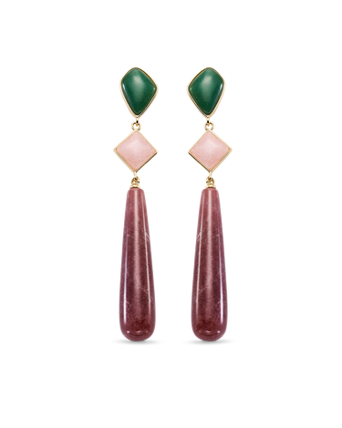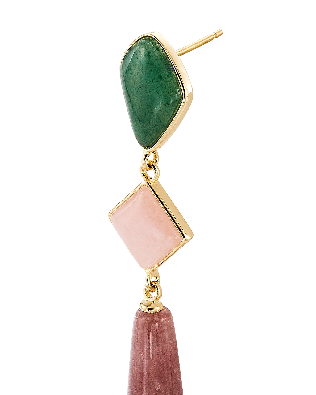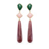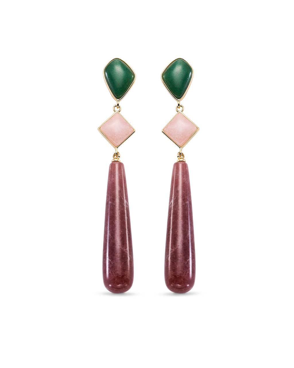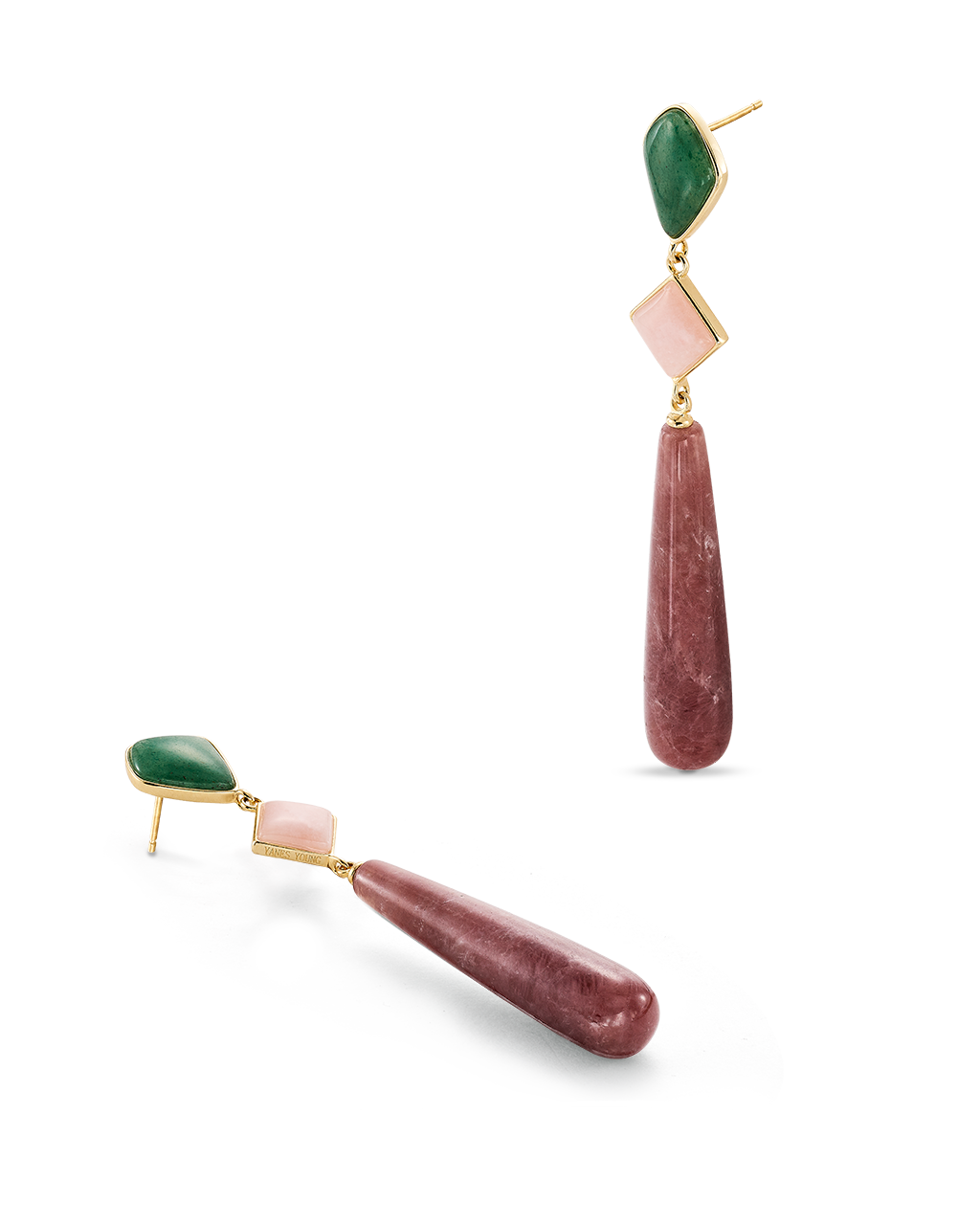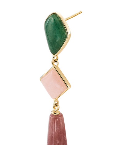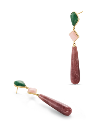 Pendientes colgantes 3 piezas, oval aventurina, rombo cuarzo rosa y gota alargada cuarzo rojo, plata de ley dorada. Medida largo total 7 cm. Colección Sidney.