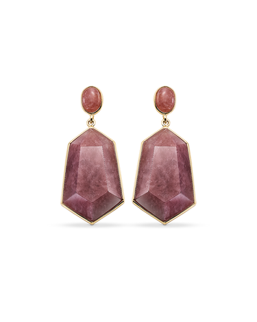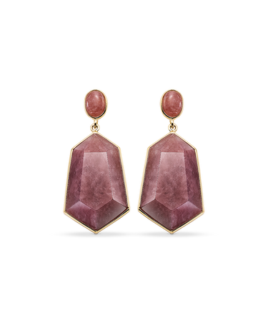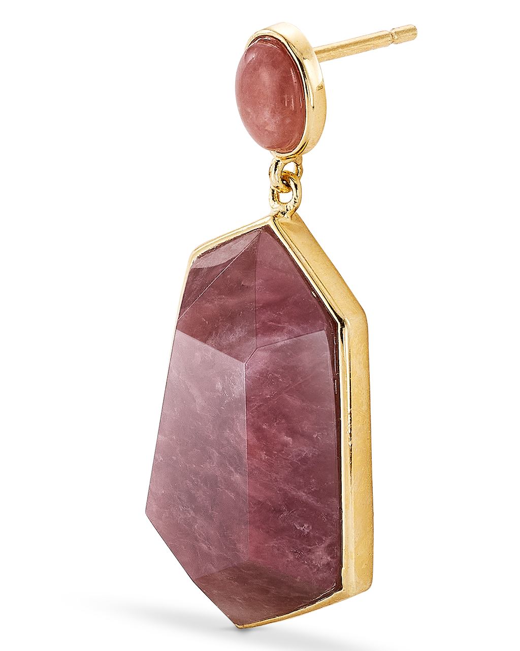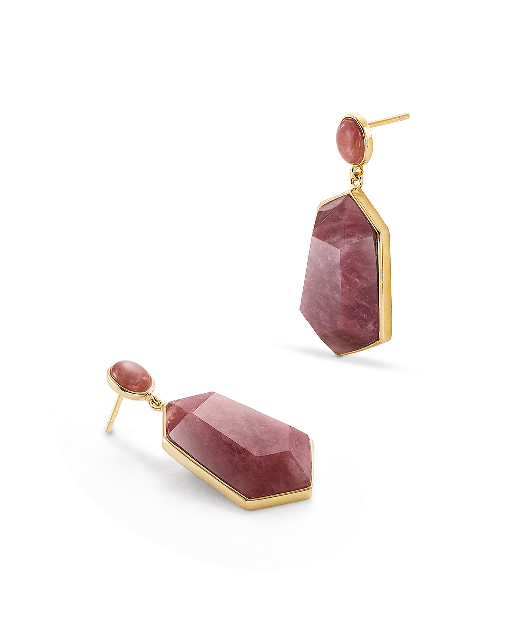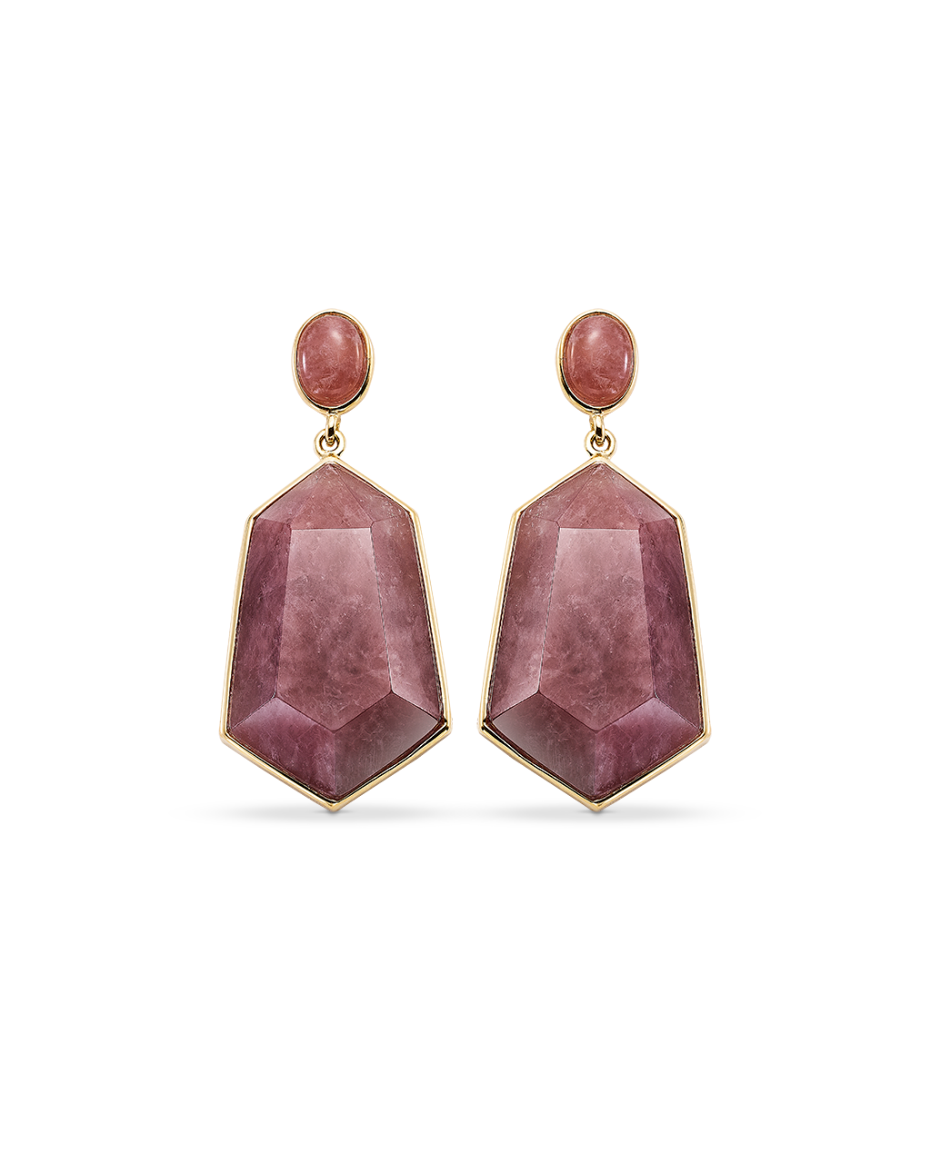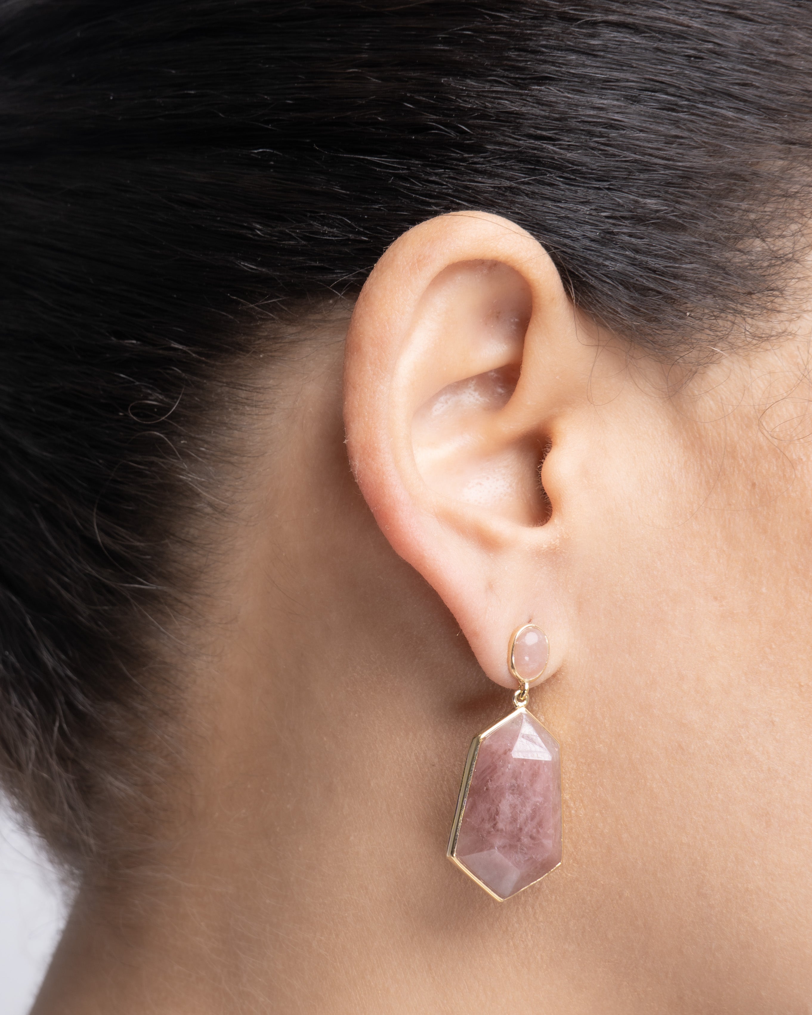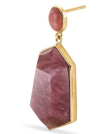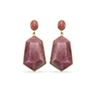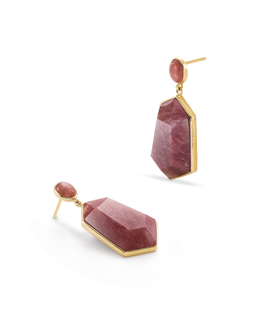 Pendientes colgantes cuarzo rojo forma hexagonal, plata de ley dorada. Medida centro 17 x 25 mm, largo total 28 mm. Colección Sidney.