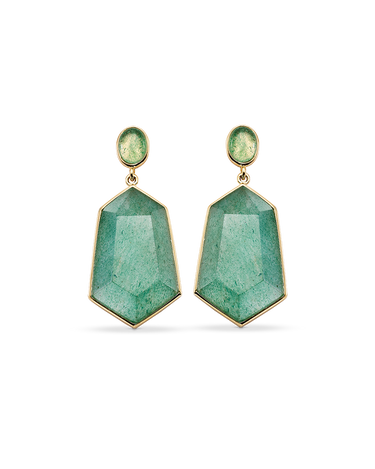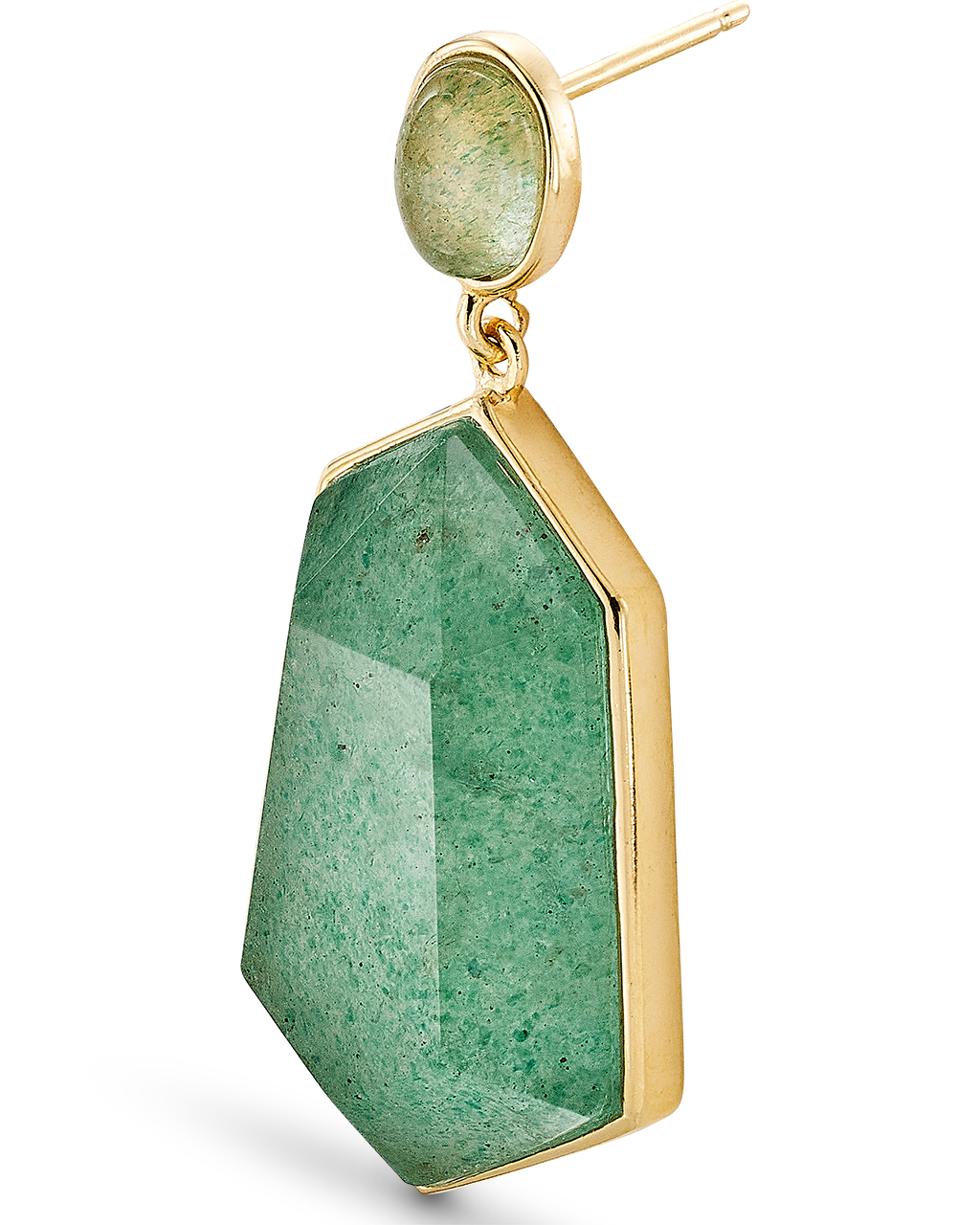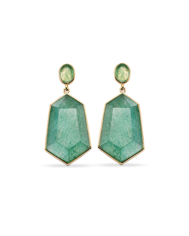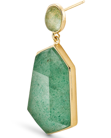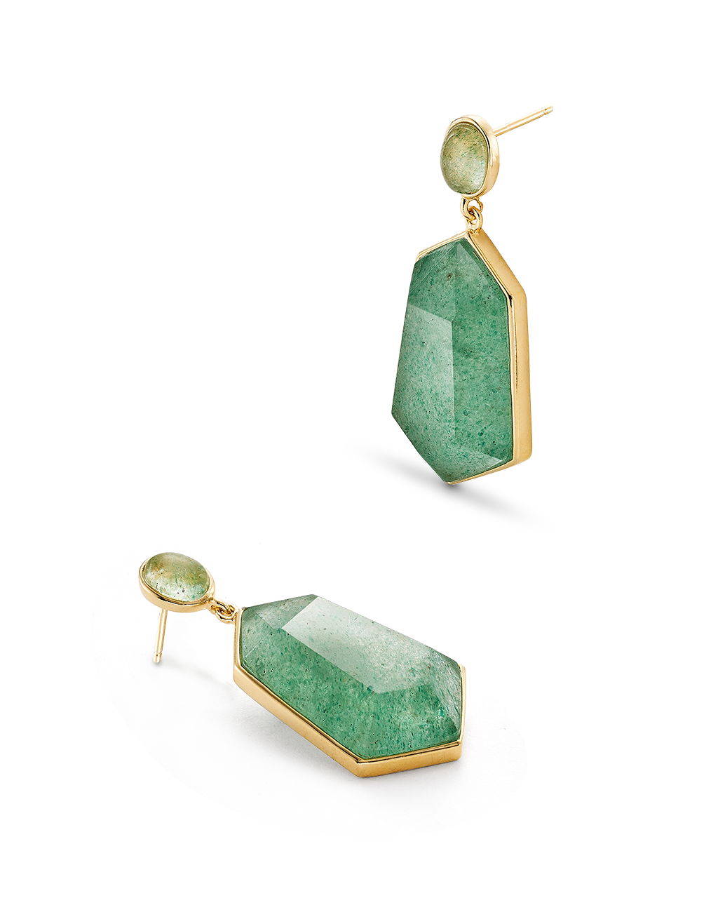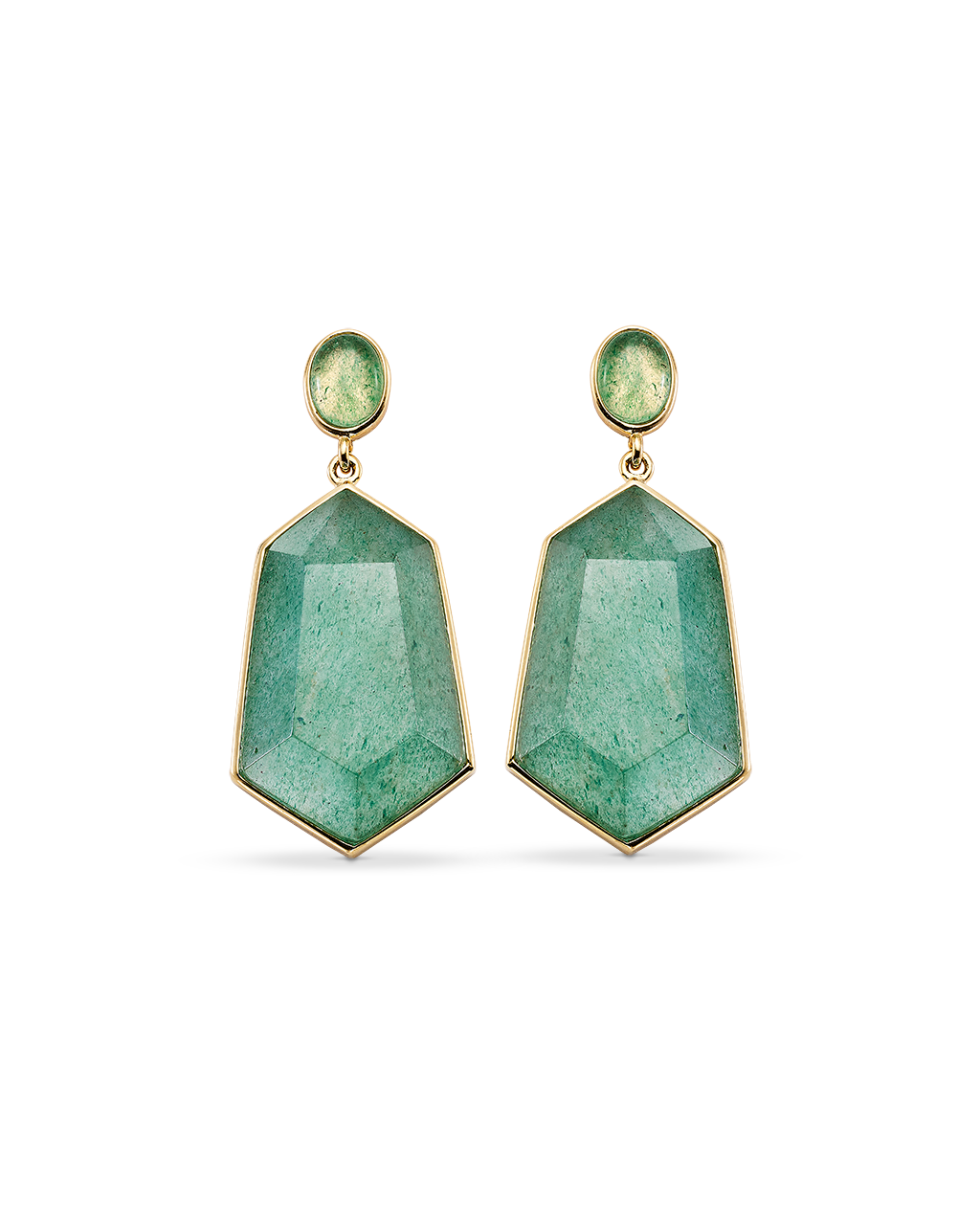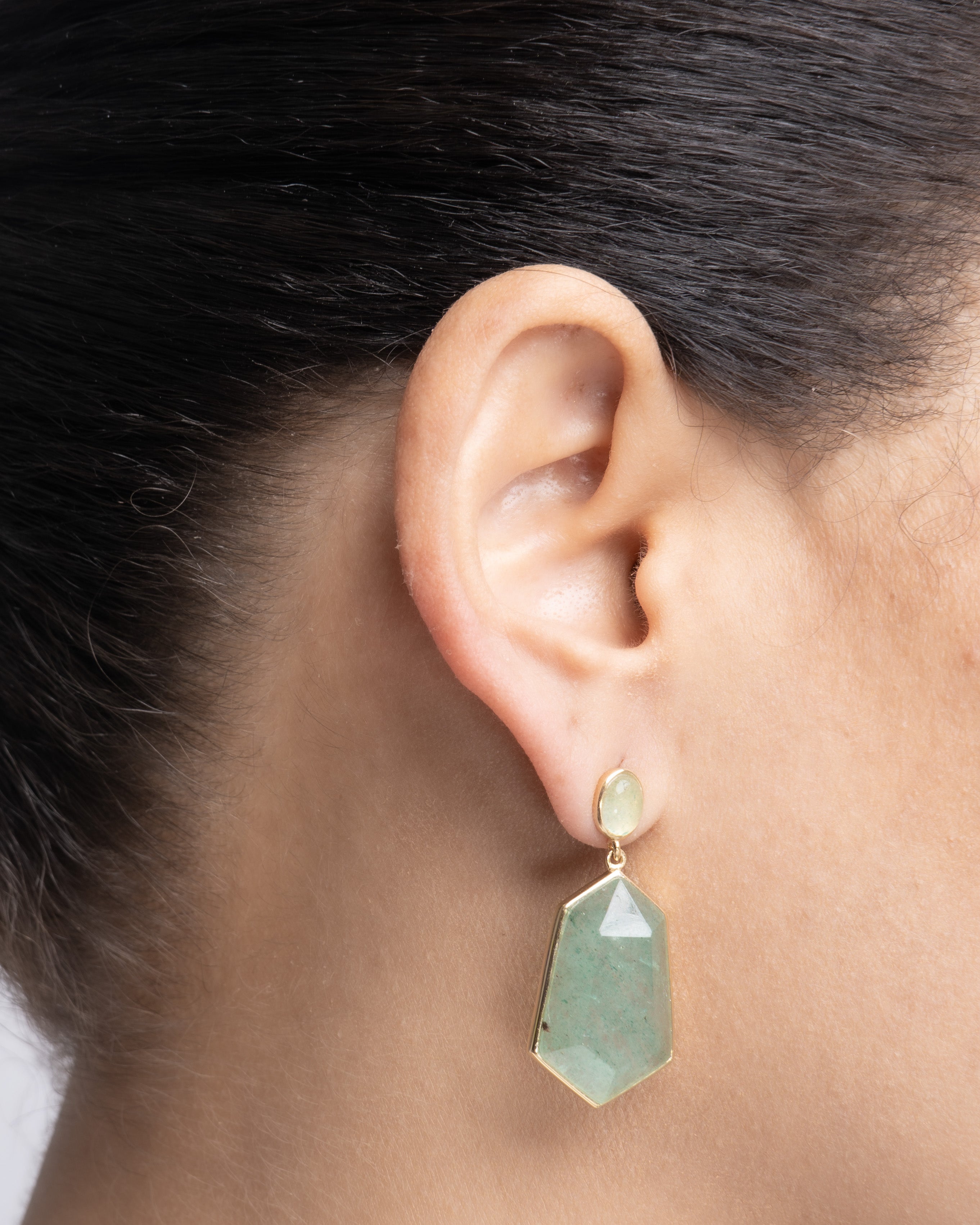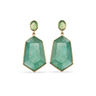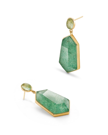 Pendientes colgantes cuarzo verde forma hexagonal, plata de ley dorada. Medida centro 17 x 25 mm, largo total 28 mm. Colección Sidney.
