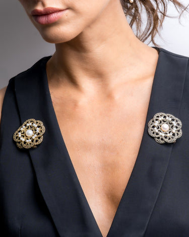 Broche de perlas floral marcasitas y perlas, plata de ley dorada. Medida centro 43 mm. Colección Viena.
