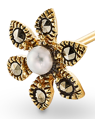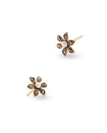 Pendientes flor, pétalos marcasitas, centro perla, plata de ley dorada. Medida 10 mm. Colección Viena.