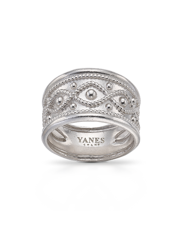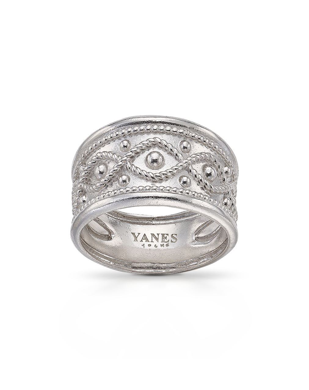 Anillo ancho acabado "tambor", cordones y bolas, plata de ley. Ancho 12 mm en disminución. Colección Malpica Young.