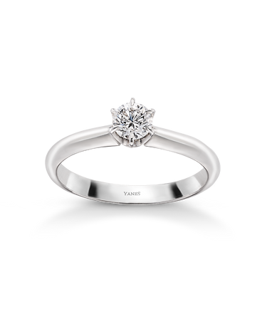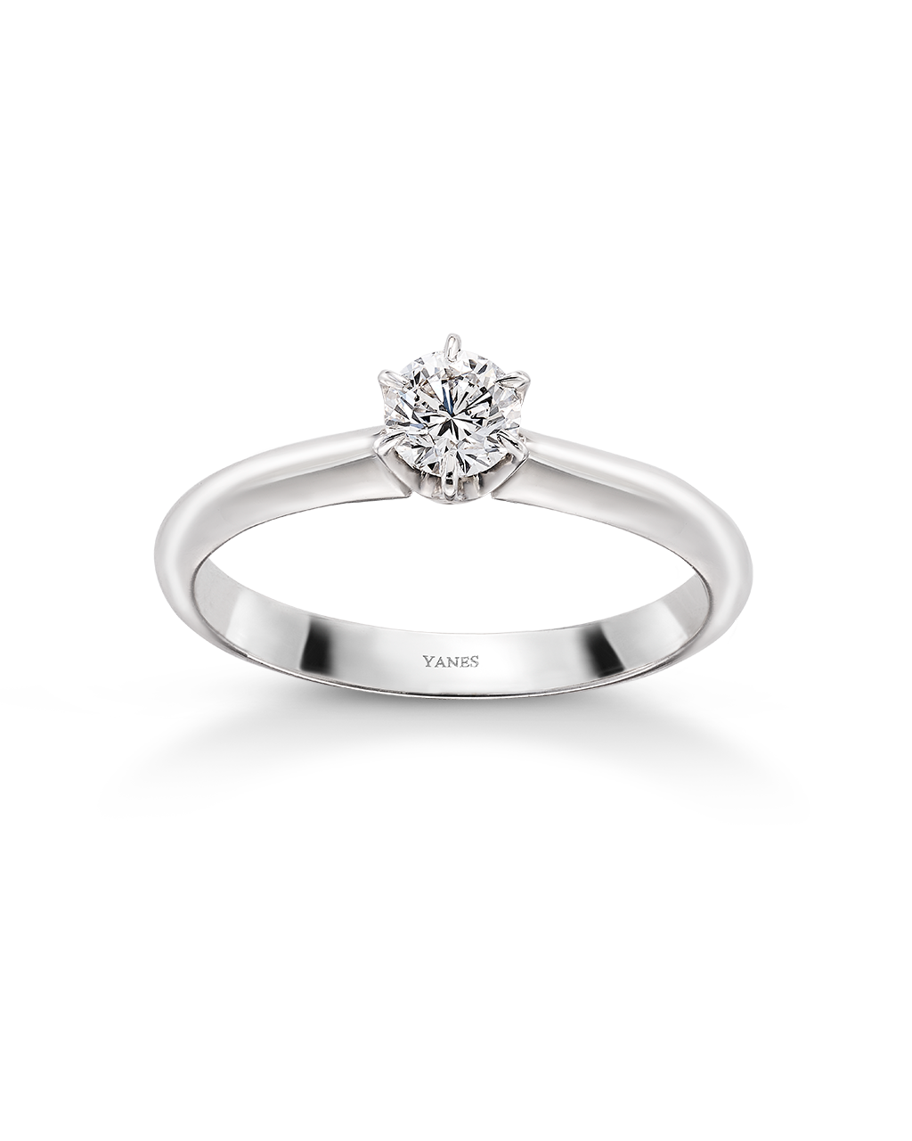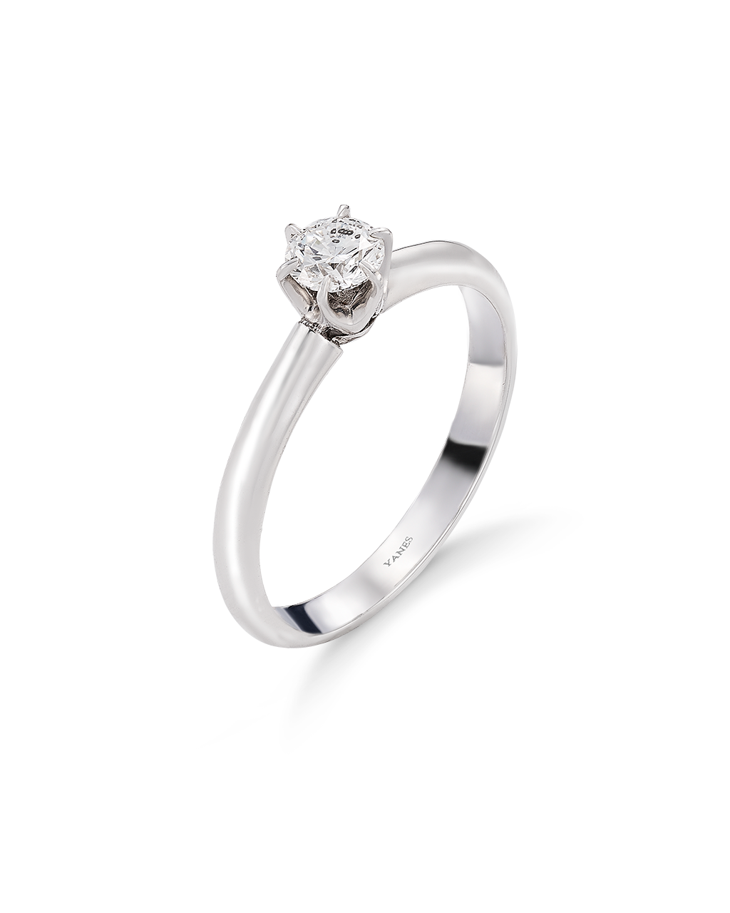 Anillo solitario seis garras, diamante talla brillante, color D, pureza SI2, peso 0,30 ct. Oro blanco de 18K. Certificado GIA 3X. Colección Compromiso.
