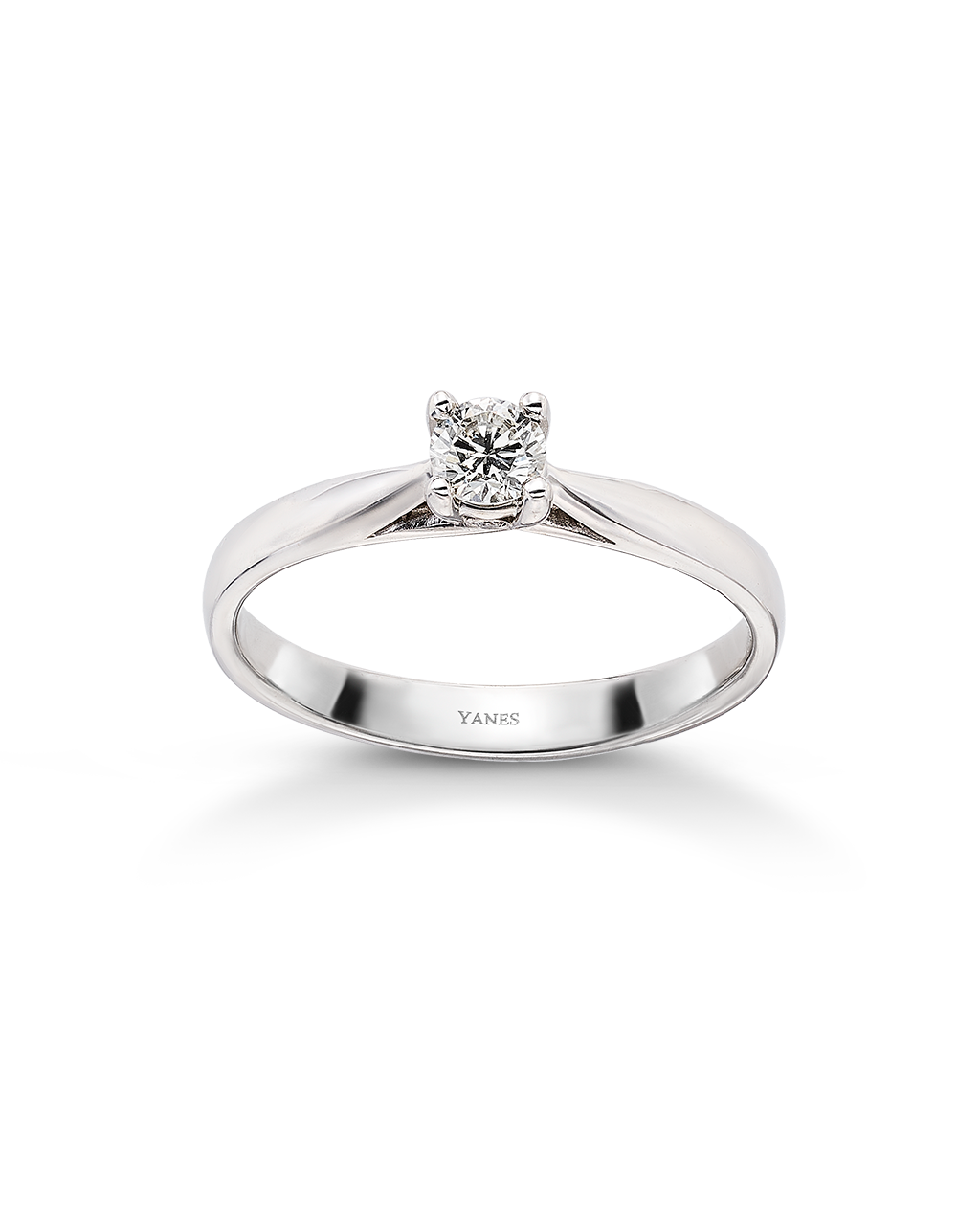 Anillo solitario, diamante talla brillante, seis garras, peso 0,20 quilates. Oro blanco de 18K. Colección Kimberly.