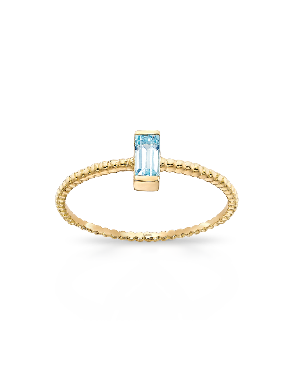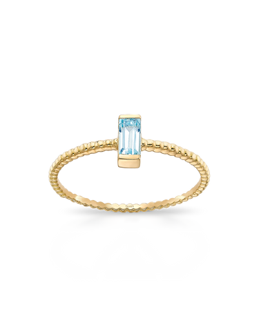 Emerald-cut blue topaz centre ring, claw set. Cord hoop. 18k gold. Motif size 6x3mm. Candy Colors Collection.