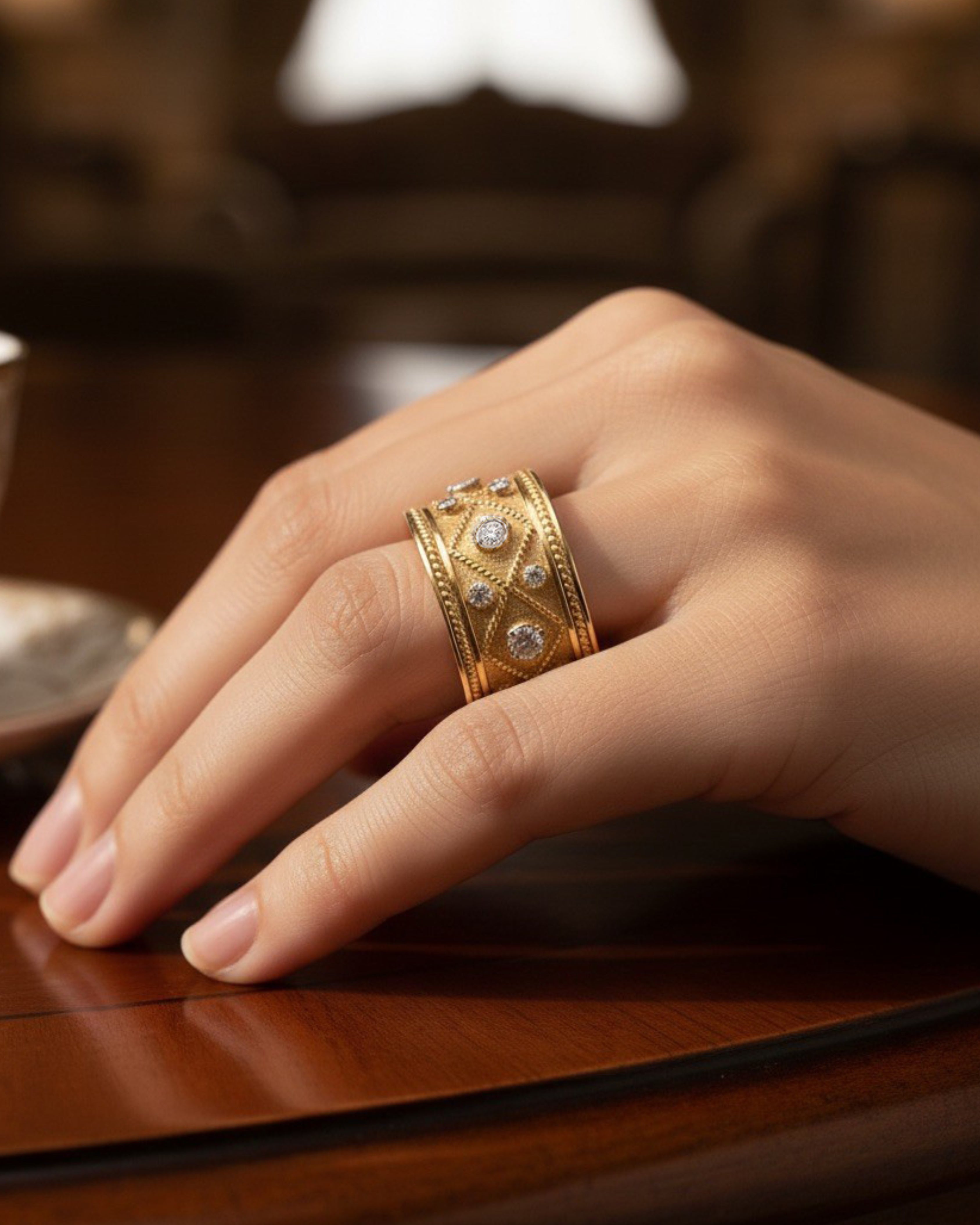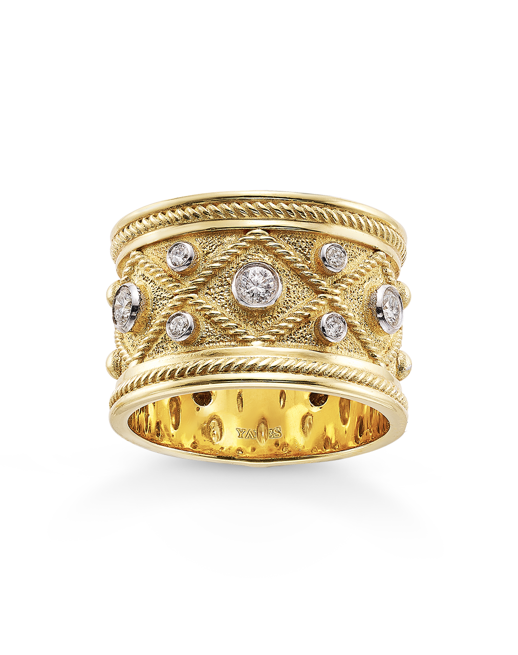 Tambor ring with brilliant-cut diamond centers, 18K yellow gold. Malpica Collection handcrafted in our workshops.