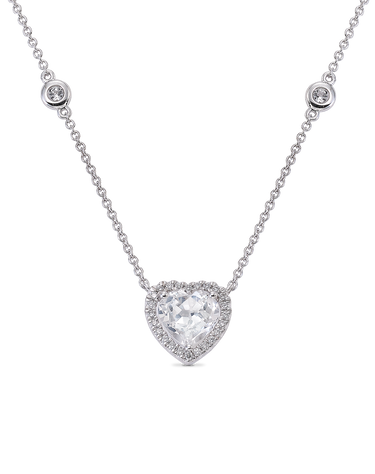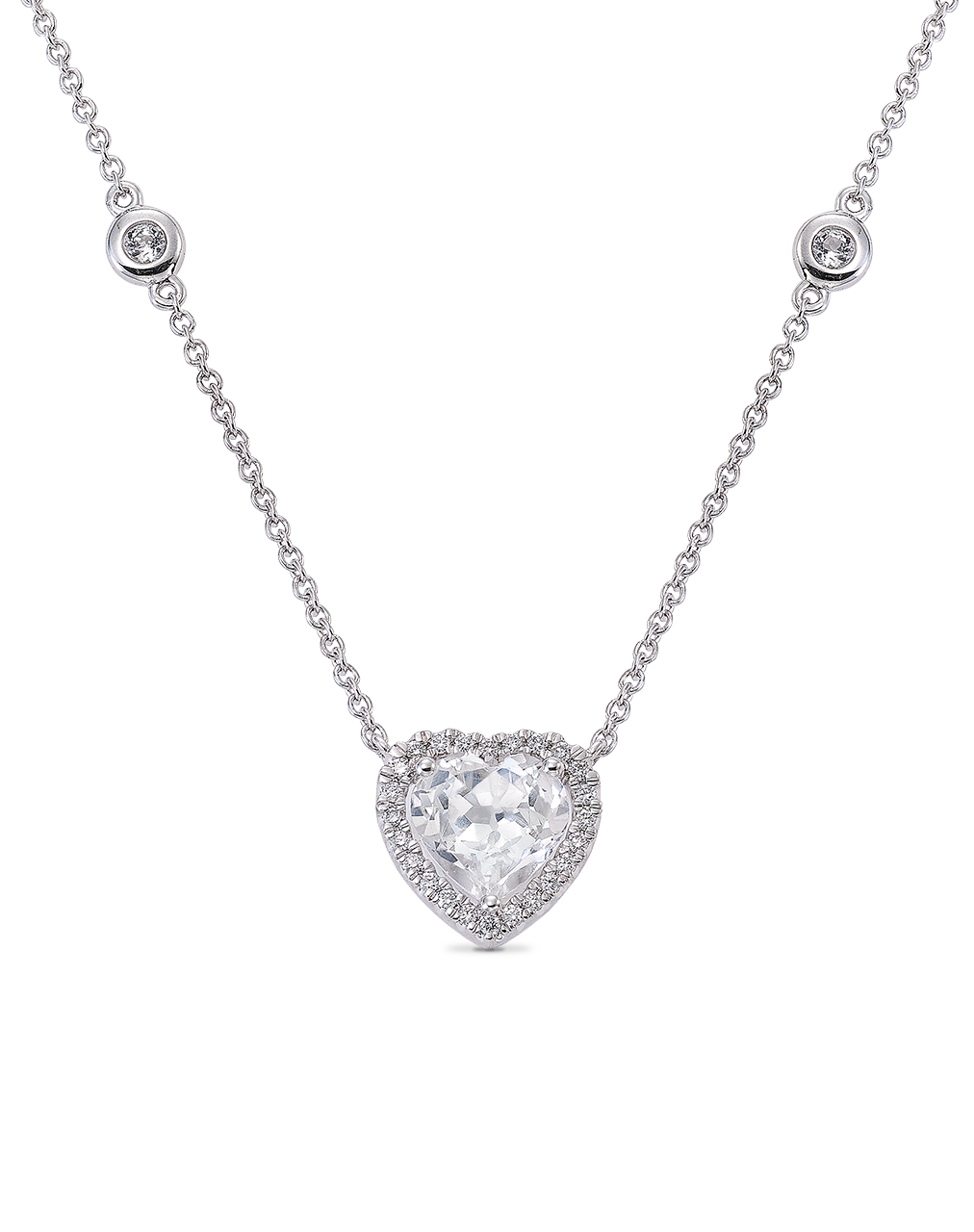 Heart-cut white topaz pendant in 18K white gold, brilliant-cut diamond border and chain. Victoria Collection.