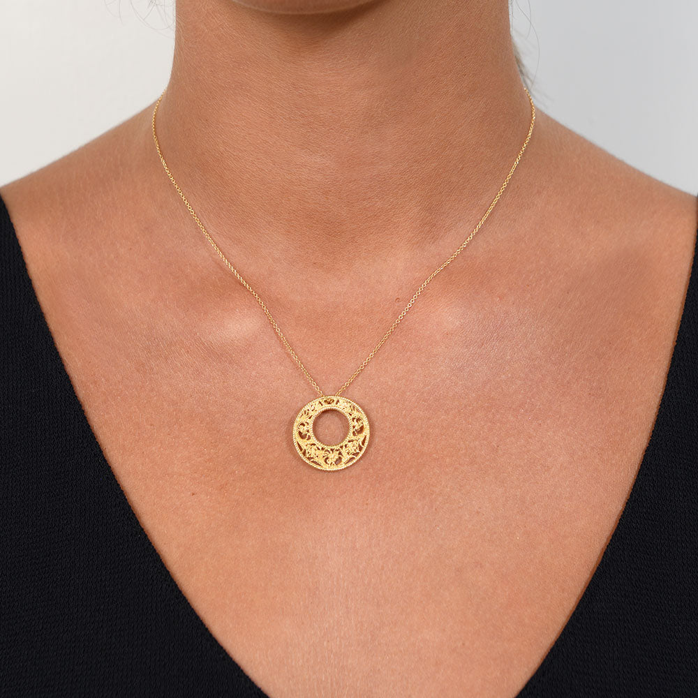 Filigree circle pendant with chain, 18K yellow gold. Alhambra Collection.