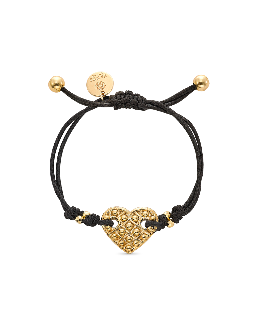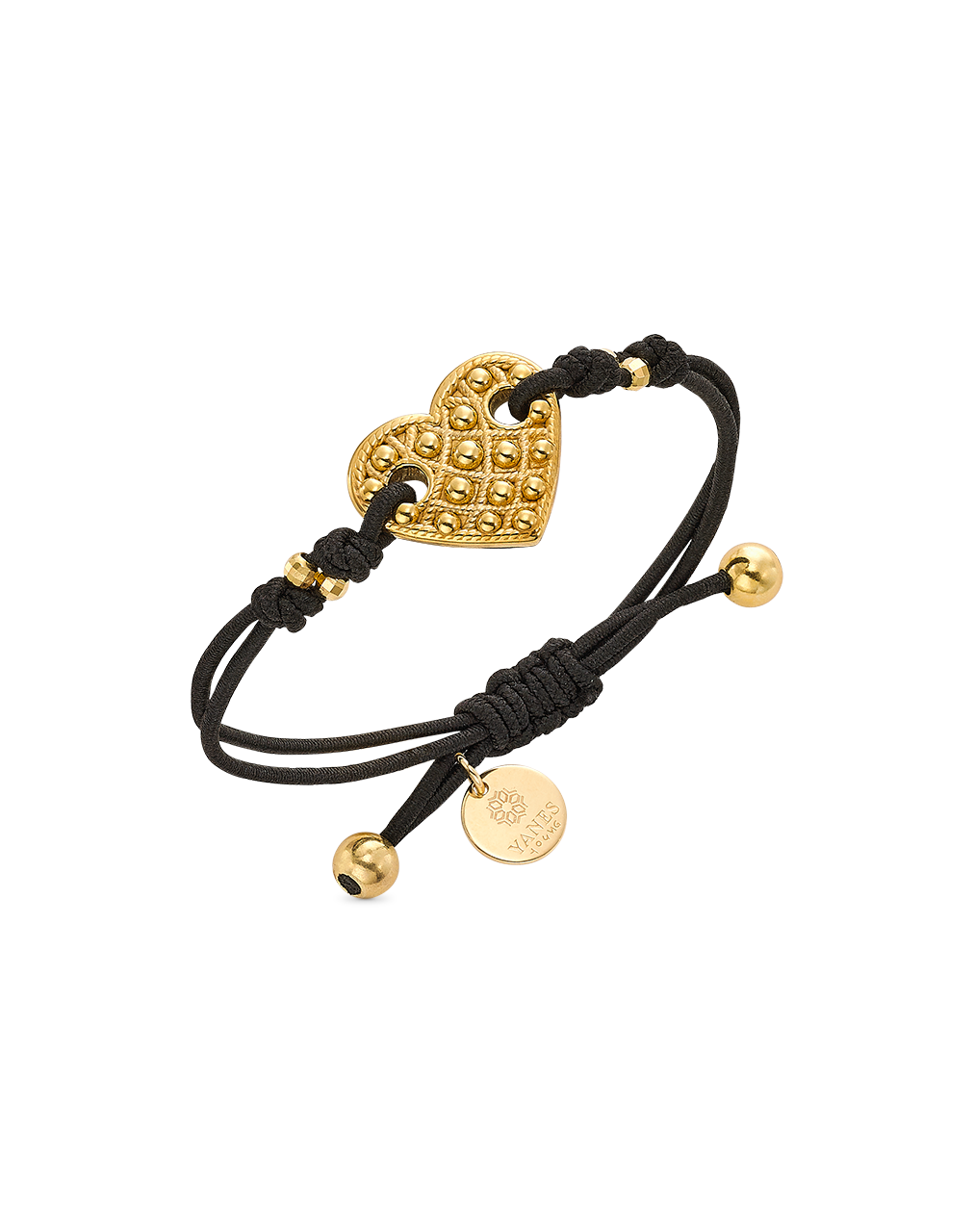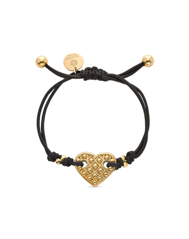 Heart center bracelet with a "drum" finish, cords and balls, gold-plated sterling silver and adjustable silk cord. Heart measurements 16 x 20mms. Malpica Young Collection.
