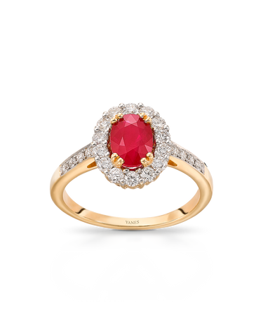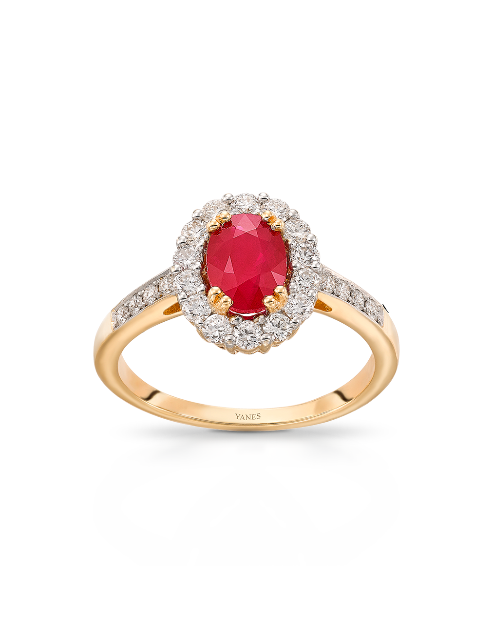 Anillo centro rubí talla oval, peso 1,15 ct, orla y brazo diamantes talla brillante, peso 0,40 ct, oro amarillo de 18K. Medidas centro 11 x 10 mm, brazo 2 mm. Colección Beauty Colors.