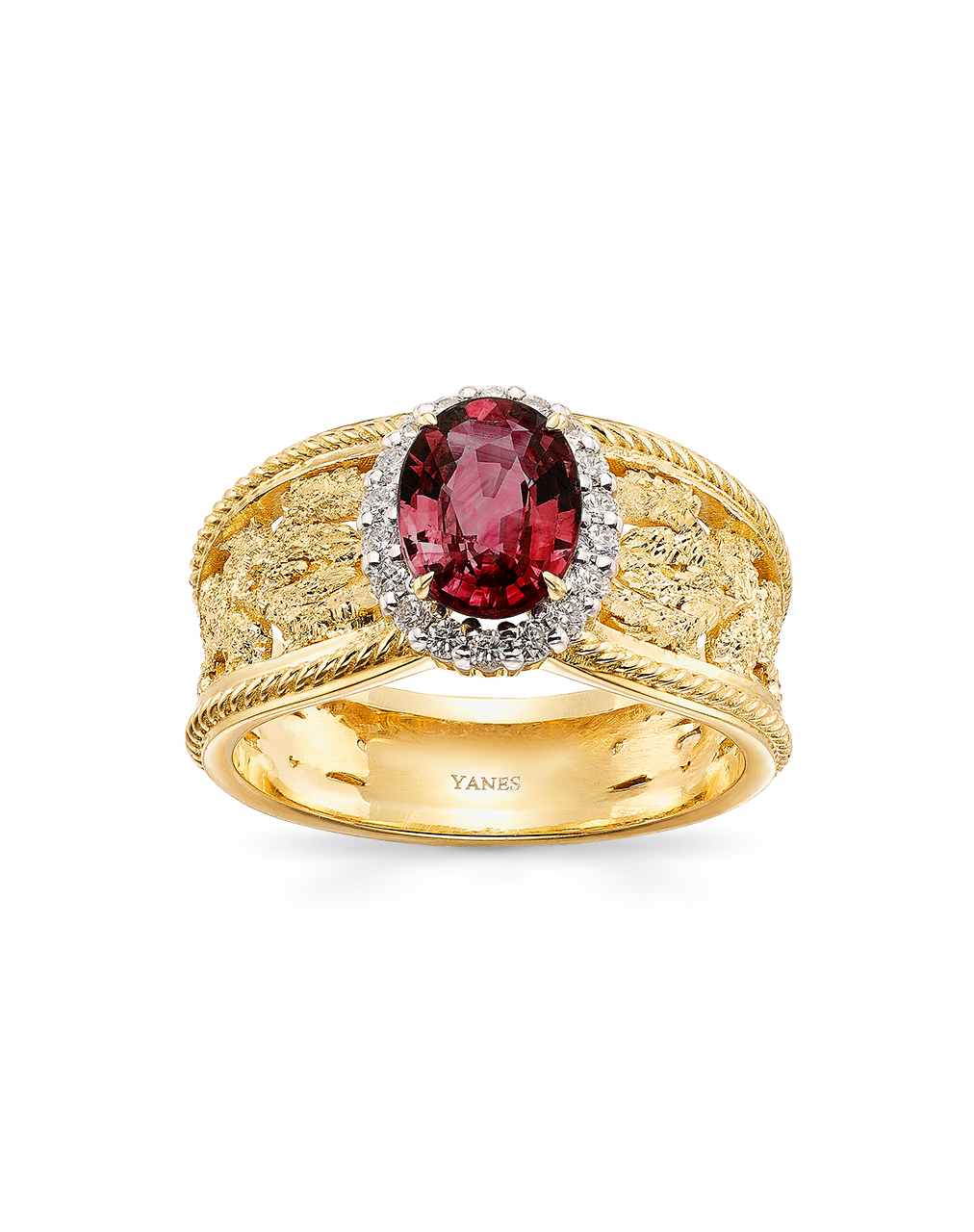 Anillo aro filigrana bisel cordón centro rubí oval 1,40 ct en orla 18 diamantes talla brillante 0,20 ct, oro amarillo de 18K. Motivo 9 x 10 mm. Ancho 10 mm en disminución. Colección Alhambra fabricada artesanalmente en nuestros talleres.