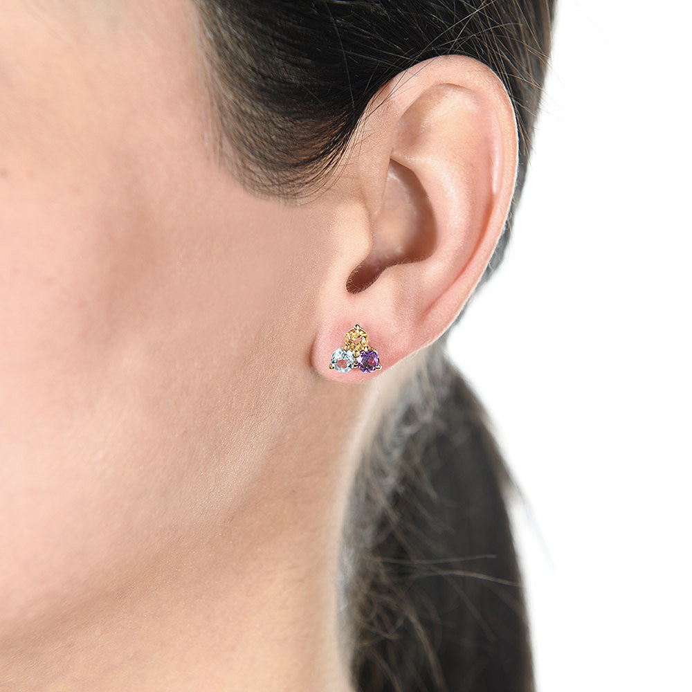 Pendientes tres colores, topacio azul, amatista y citrino, en garras, oro amarillo de 18K. Medida 6 mm. Colección Candy Colours.