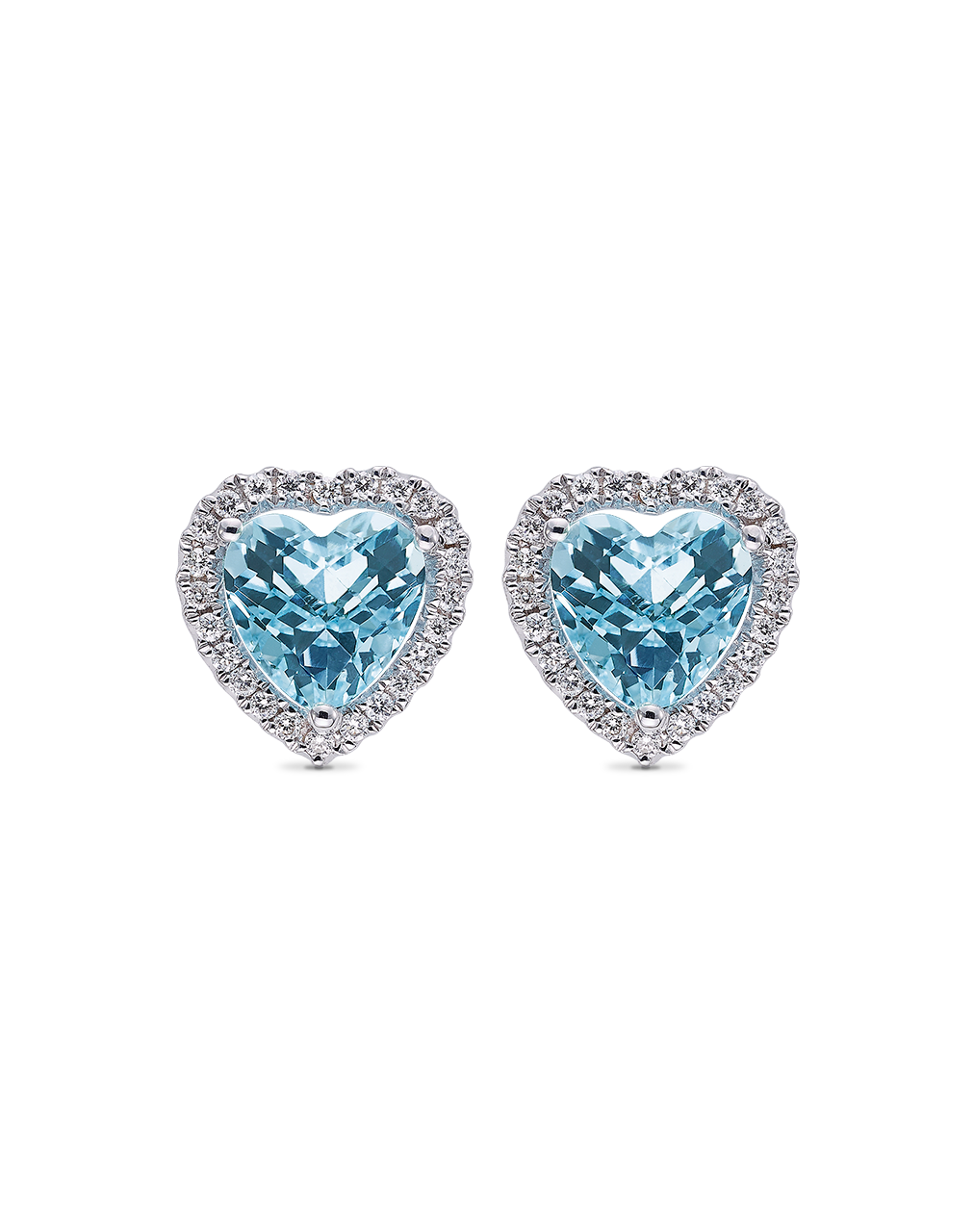 Pendientes topacios azules talla corazón, orla diamantes talla brillante, oro blanco 18K. Colección Victoria.