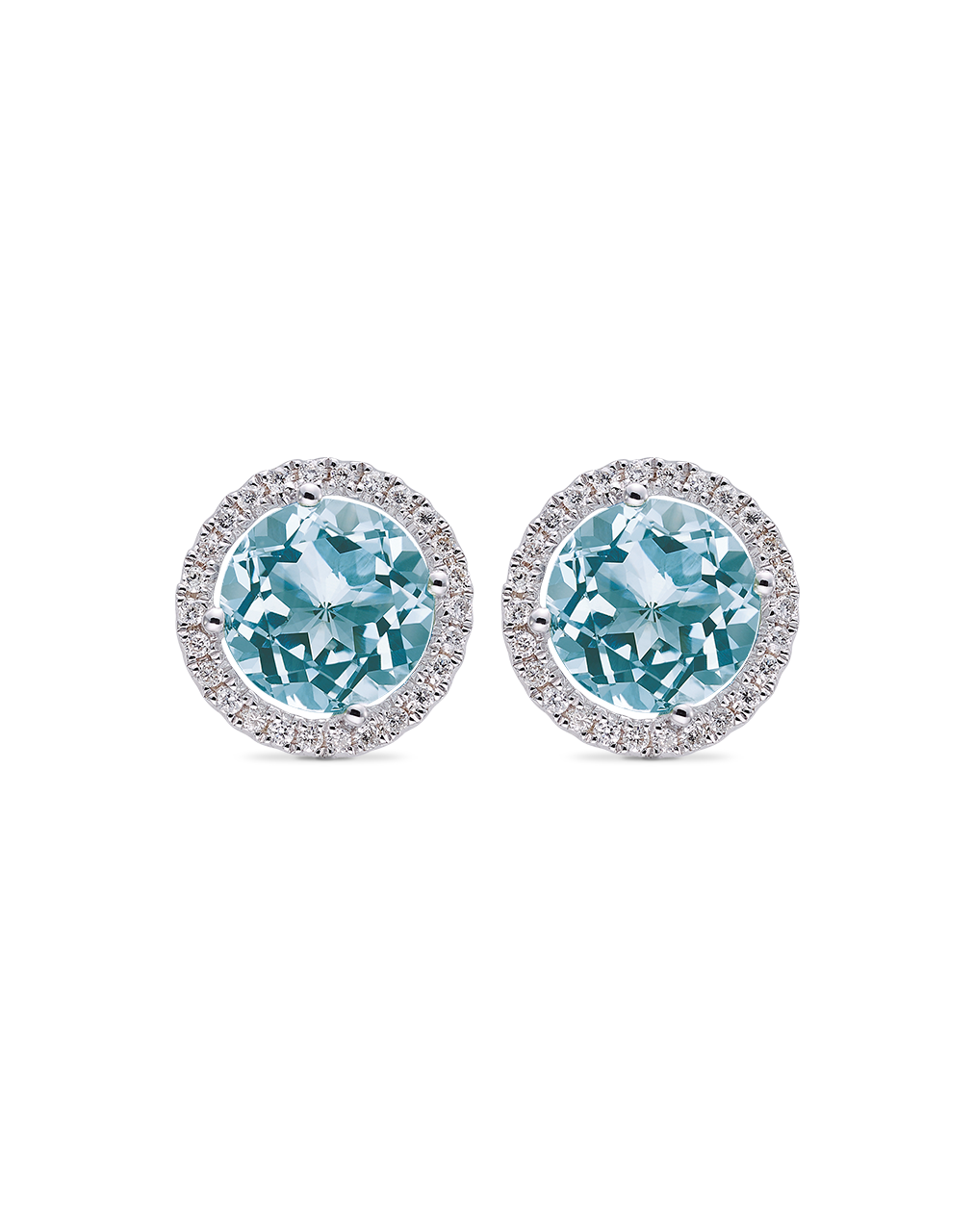 Pendientes topacios azules redondos, orla diamantes talla brillante, oro blanco de 18K. Colección Victoria.