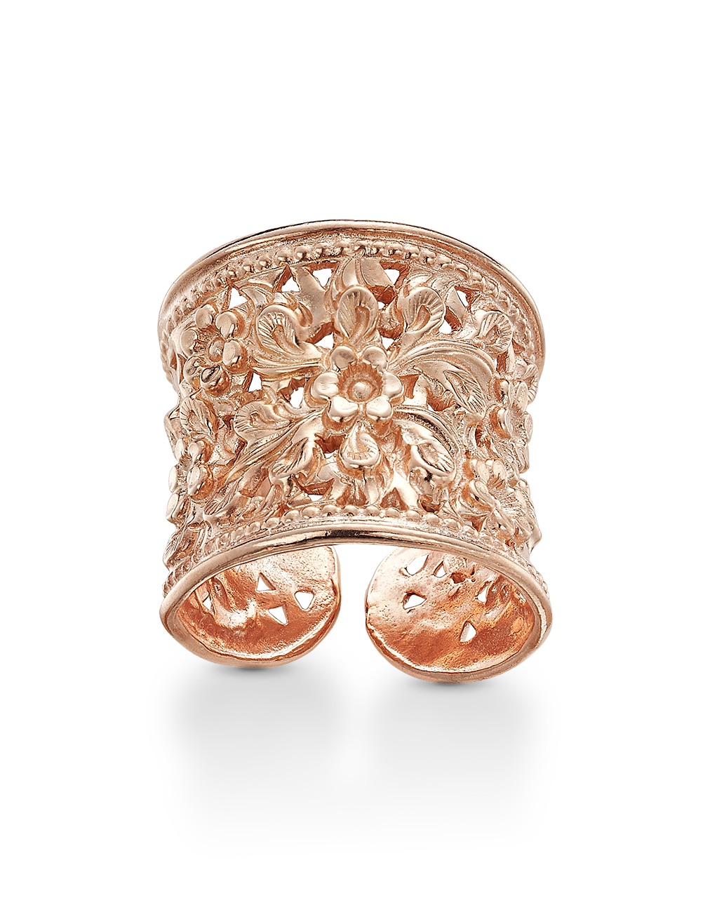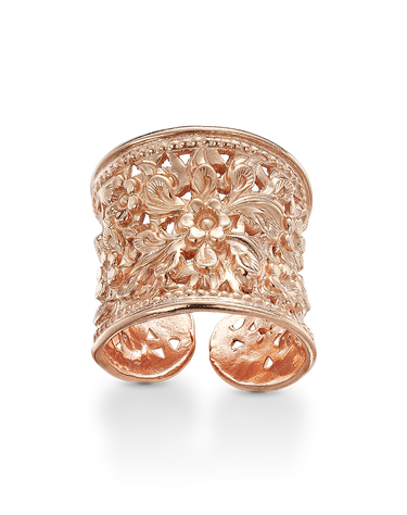 Anillo dibujo filigrana flores, plata de ley rosa. Talla única ajustable. Ancho 2 cm. En disminución. Colección Traviata.